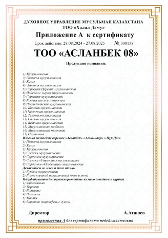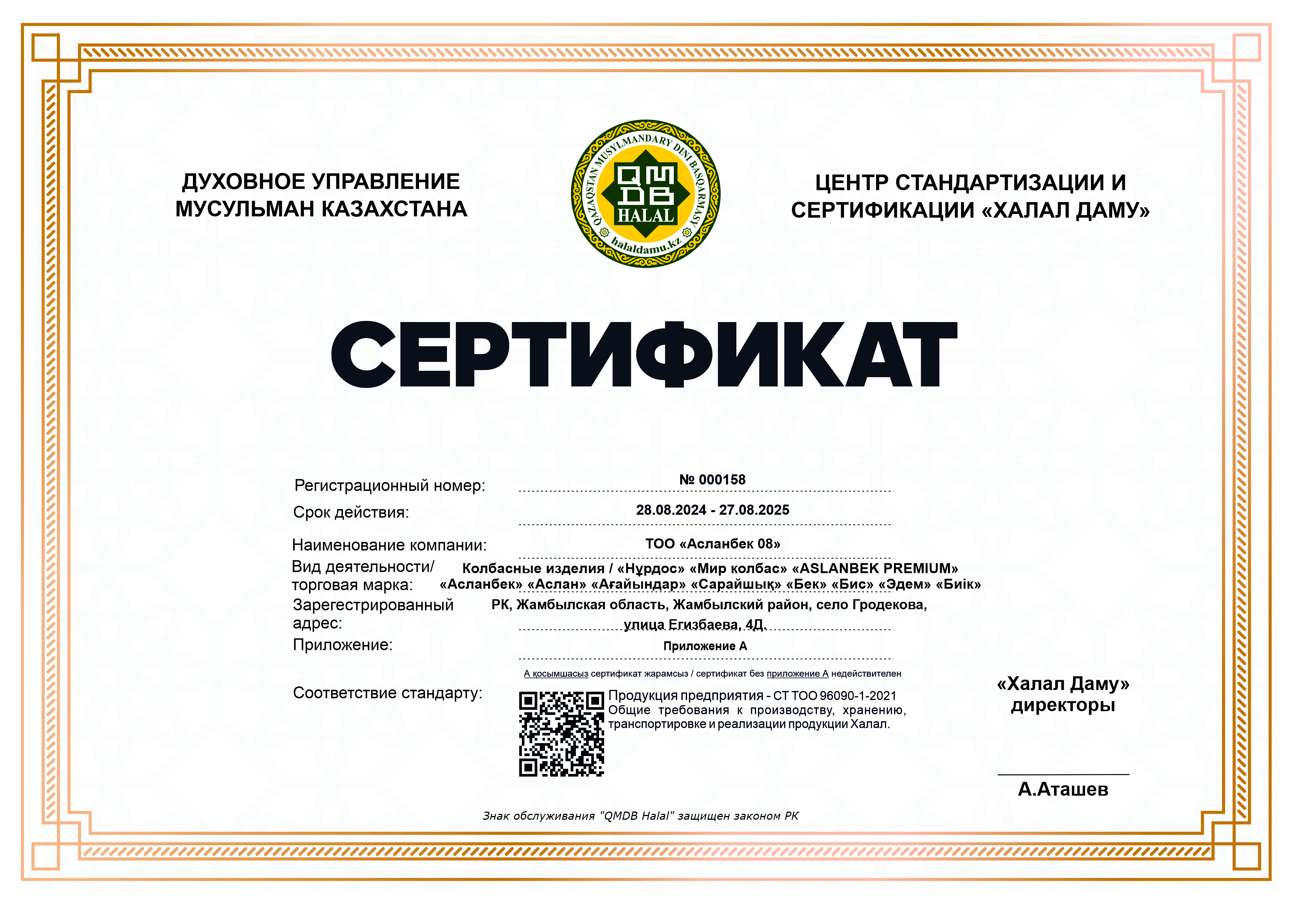 «Нұрдос» «Мир колбас» «ASLANBEK PREMIUM» «Асланбек» «Аслан» «Ағайындар» «Сарайшық» «Бек» «Бис» «Эдем» «Биік»
