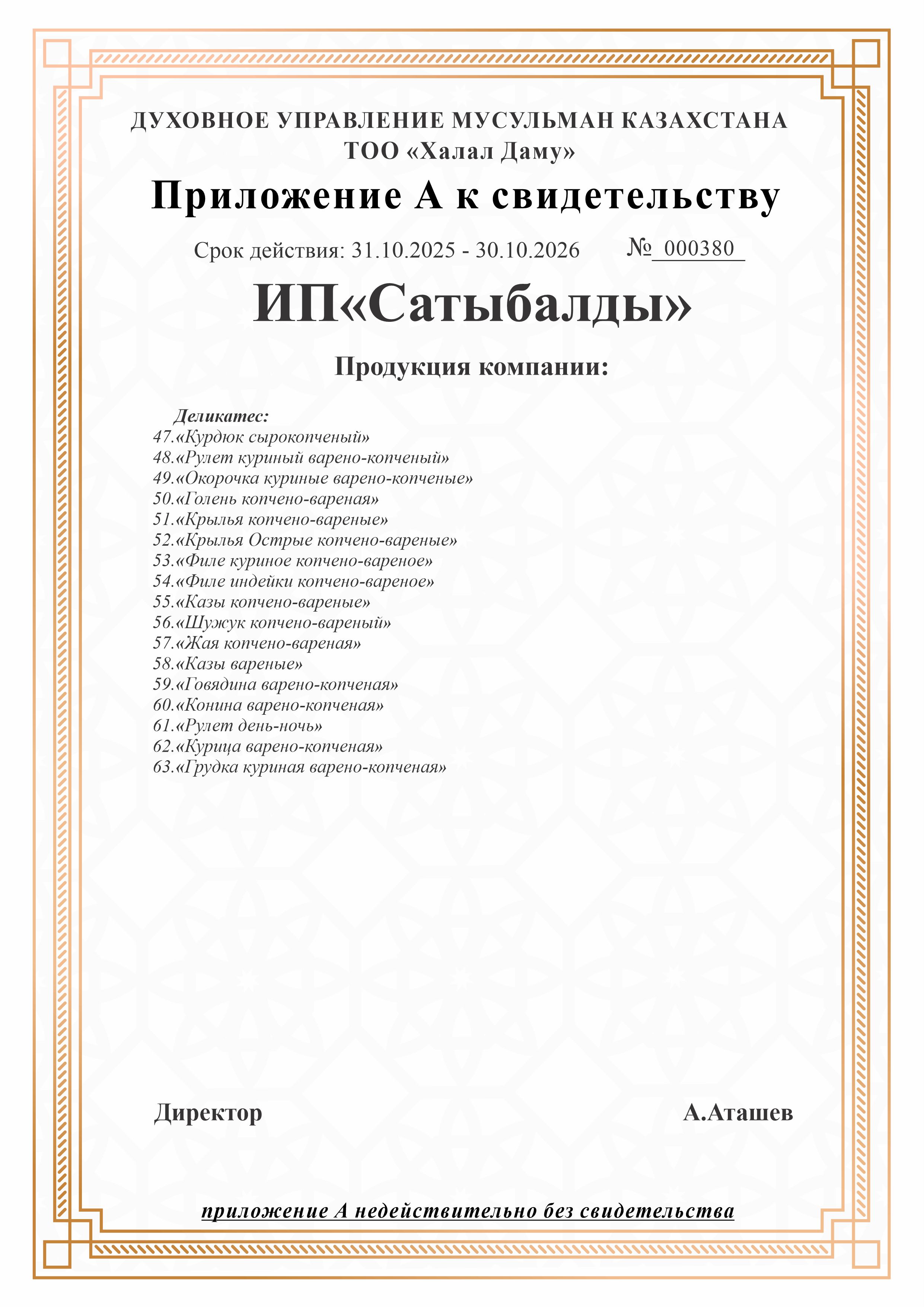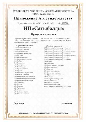«AIDYN NYRY ET» «ОТAN» «MADLEN» «MARLEN» «EVOS» «ASYL TAU» «ALTYN TAU» «BAVARIA» «MUSLIM» «Колобок и К⁰» «BUKAET» «Бек Султан» «АSEL» «AIDOS»