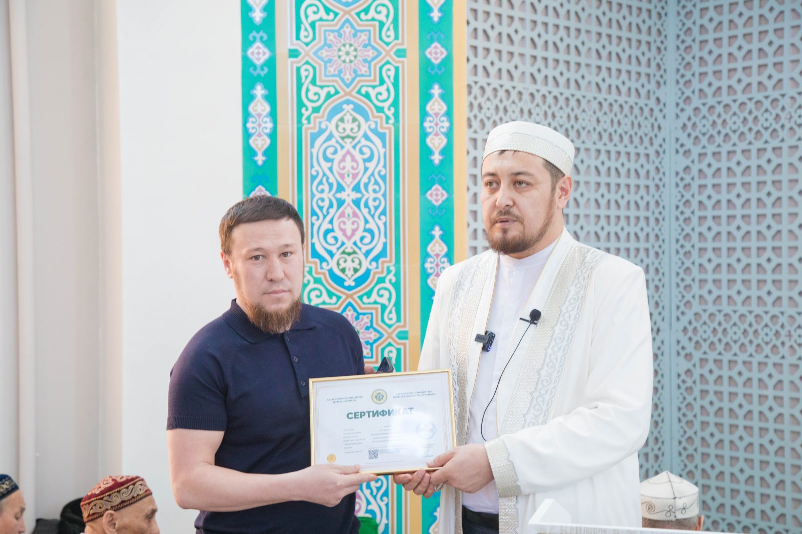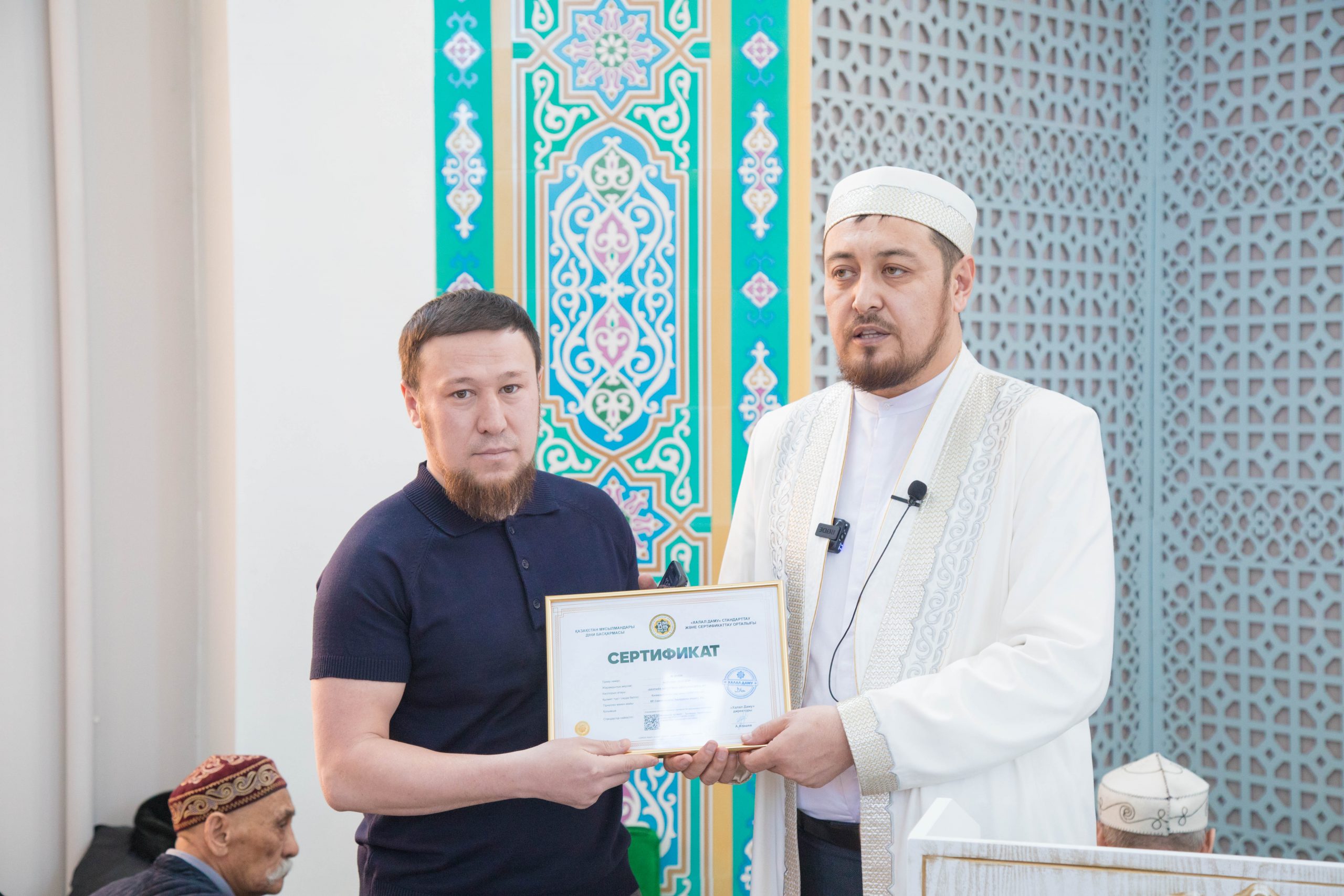 Мешітке жиналған жамағатқа адал астың құлшылық пен тіршіліктегі маңызын, сертификатталған халал өнімді тұтыну қажеттілігін түсіндірген Асқар Әбітайұлы «One palau» дәмхана басшысы Айтқұрман Әділханұлына халал сертификатын табыстап, жұмыстарының жемісті болуына тілектестігін білдірді.