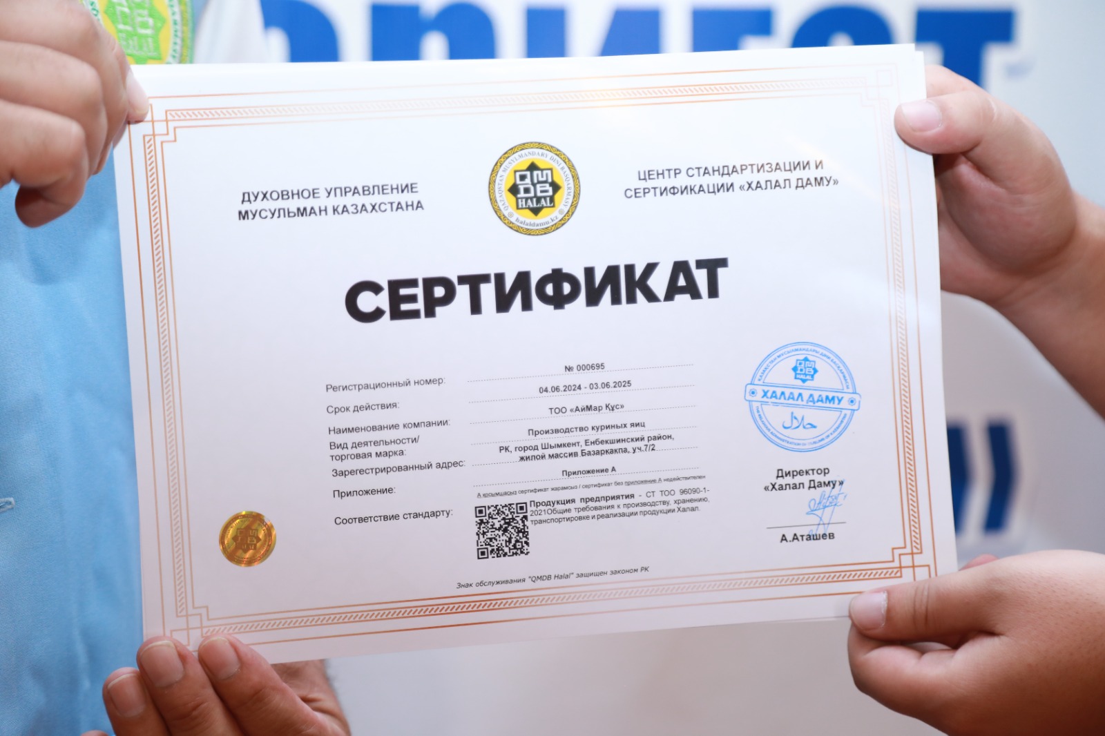 Шымкент қаласындағы «Аймар құс» жұмыртқа өнімдері «QMDB Halal» стандарты бойынша сертификатталды. Сертификатты «Халал Дамудың» жергілікті өкілі Сарыбаев Қазыбек табыстады. Сертификаттау шараларының оң нәтижесінен кейін аталған жұмыртқа өнімдері «Халал өнімдерді өндіру, өңдеу, дайындау, сақтау, тасымалдау» стандарты талаптарына сай деп танылды.