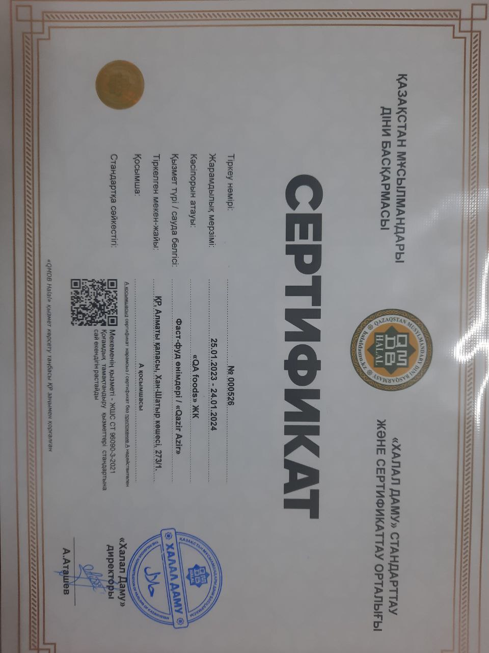 «Халал Дамудың» Алматы қаласы бойынша жауапты өкілі Чадаев Маратхан «Qazir Azir» фаст-фуд өнімдерін өндірушісіне «QMDB Halal» сертификатын табыстады.