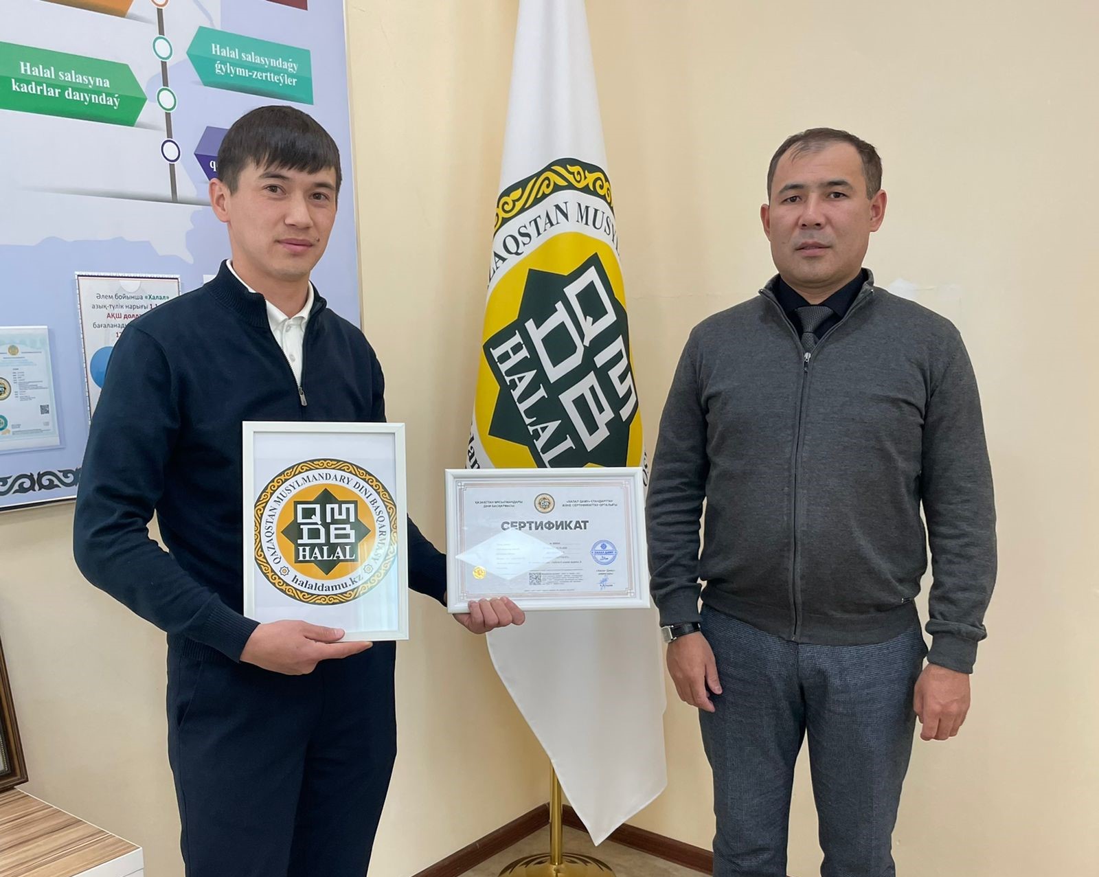 Ет дүкенінің халал стандарттарына сай қызмет ету ниетіне байланысты және арнайы тексерістерден кейін, «Халал Даму» ЖШС-нің директоры Айбек Асқарбекұлы мекеме басшылығына арнайы құжатты табыс етті.