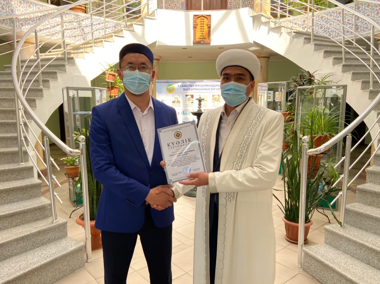 Бүгін Алматы қаласындағы «Мырзахмет» және Таугүл-з» мешіттерінің асханасына ҚМДБ «Халал Даму» ЖШС тарапынан қойылатын жалпы талаптар стандартына сай болғаны үшін сертификат берілді.