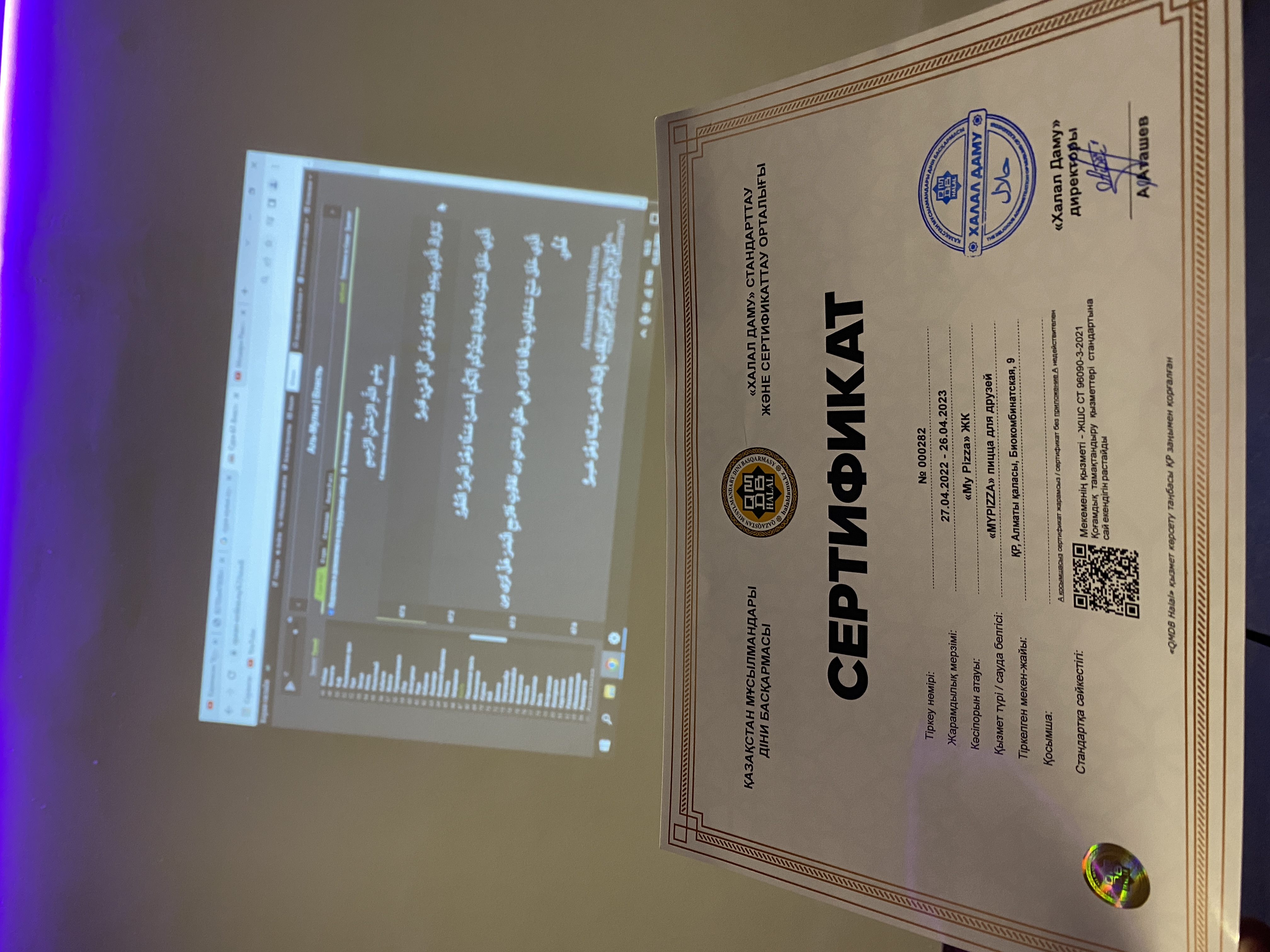 Сонымен қатар, дәмхана қызметкерлері мен басшылығына халал турасында оқу-семинары ұйымдастырылып, түсіндіру жұмыстары жүргізілді. «My Pizza» фаст-фуд өнімдеріне берілген «QMDB Halal» сертификаты 27.04.2022-26.04.2023 мерзімі аралығында жарамды. Дәмхана мекен-жайы: Алматы қ., Биокомбинатская, 9.
