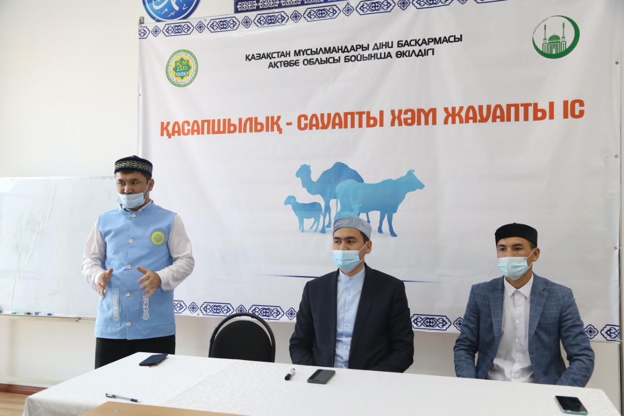 **Қасапшылардың діни сауатын жетілдіру мақсатында «Халал Дамудың» Ақтөбе бойынша өкілдігінің ұйымдастыруымен Ақтөбе қалалық мешітінде «Қасапшылық – сауапты һәм жауапты іс» тақырыбында қасапшыларға арналған семинар өткізілді.** --- Семинарға Ақтөбе қаласының бас имамы Нұрлыбек Күзембаев және "Халал Дамудың" жергілікті өкілі Абдусаламов Жарасхан, наиб имамдар мен жергілікті қасапшылар қатысты. Қасапшылардың білімін жетілдіру мақсатында ұйымдастырылған семинарда шариғат талабына сай мал сою ережелері,мал сою мен ет өңдеуге қойылатын халал стандарт талаптары түсіндірілді.Шариғатқа сай мал бауыздау талаптары аят-хадис үкімдері, дін ғұламаларының еңбегі негізінде кеңінен тарқатылып айтылды. Халал сойылған еттің адам денсаулығына пайдасы мен бүгінгі күндегі халалға қатысты өзекті мәселелері де қозғалды. "Қасапшылық - сауапты һәм жауапты іс" оқу-семинарына "ҚМДБ халал" стандарты бойынша мал бауыздап, ет өңдеуге, "ҚМДБ халал қасапшы" куәлігін алуға ните білдірген 9 қасапшы қатысты. Қатысушылар тарапынан қойылған сұрақтарға жауап беріліп, ел игілігіне қызмет етіп, отандық халал, таза ет өнімдері өндірісін дамытуға ат салысуға шақырды.