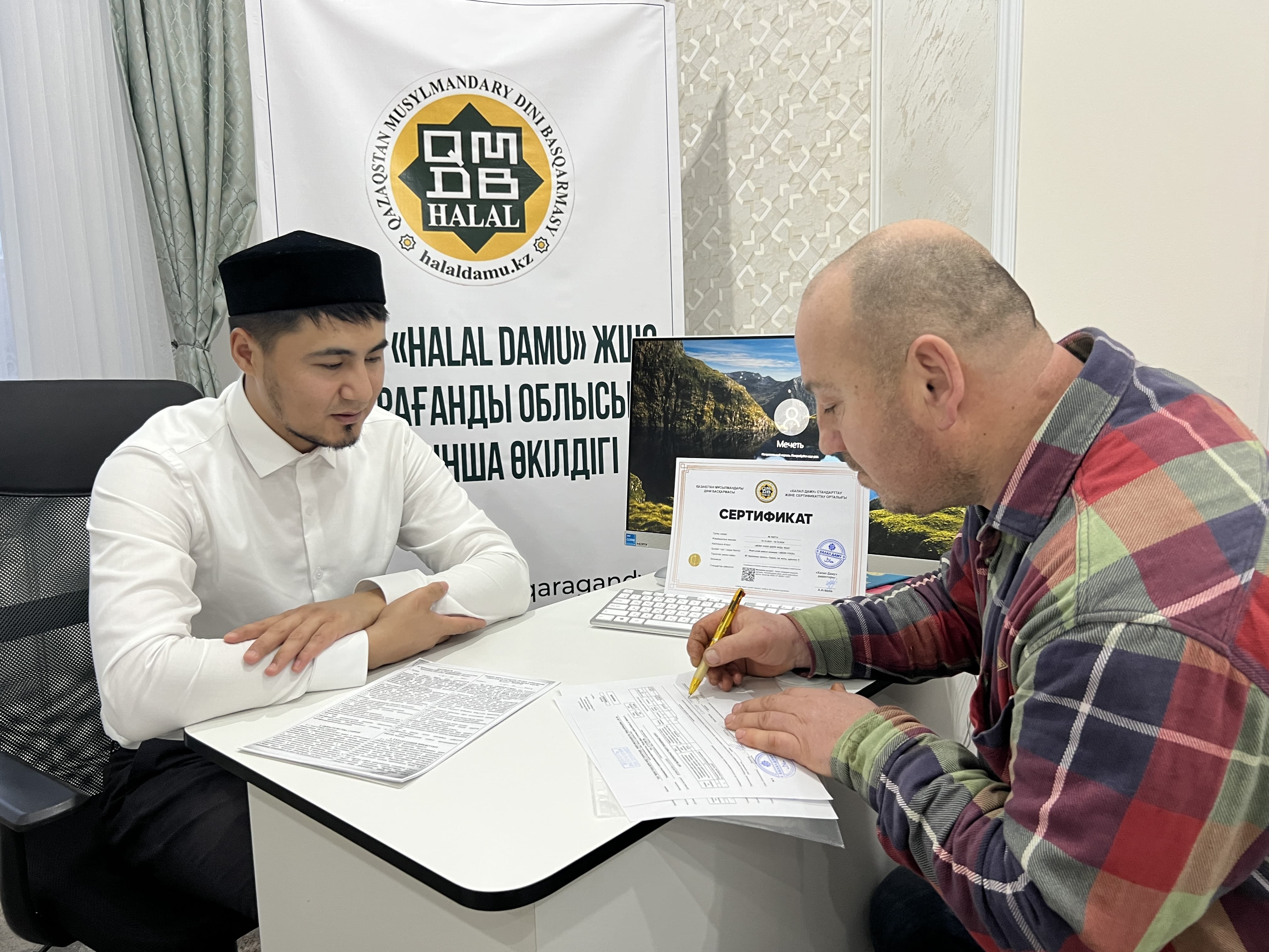 Қарағанды қаласындағы «Berk Food» сауда белгісімен шығарылатын жартылай фабрикаттар өндіруші кәсіпорын өкіліне жергілікті маманымыз Амангелді Асқаров «QMDB Halal» сертификатын табыстады.