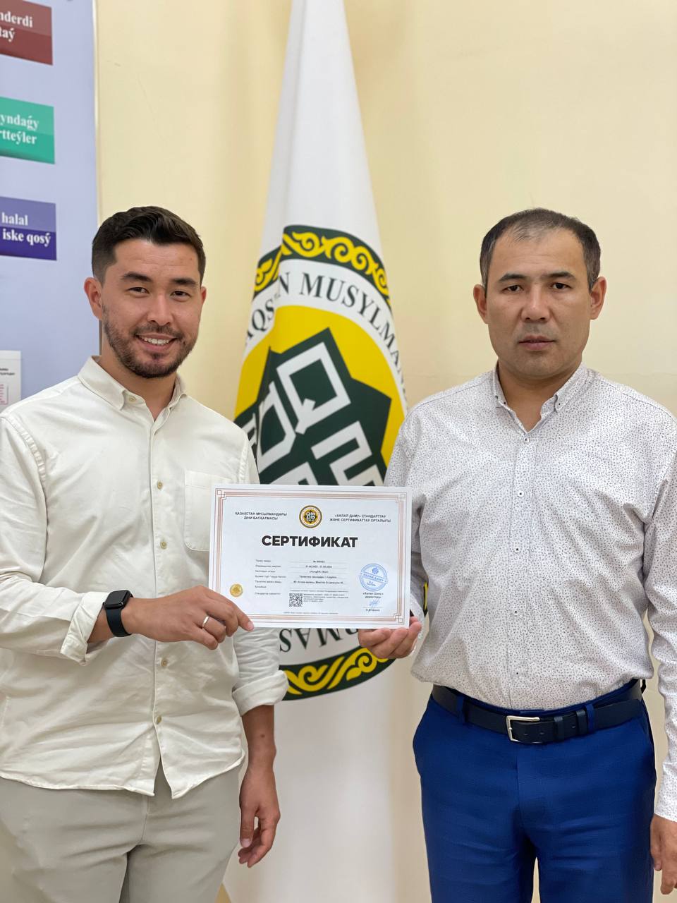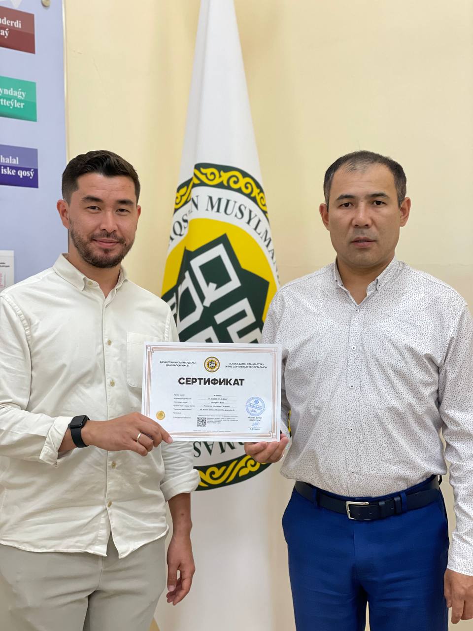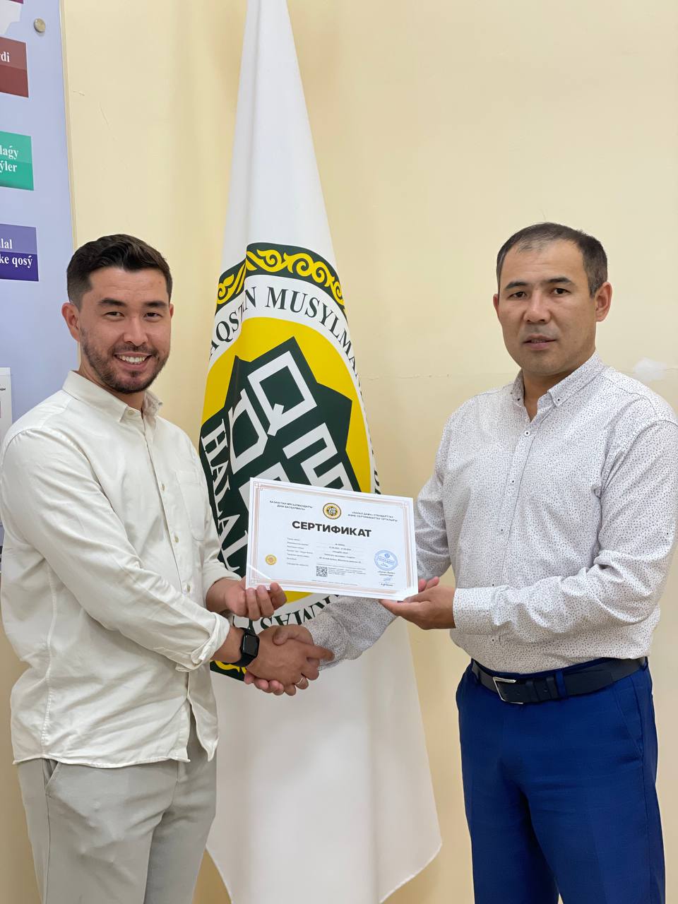 ҚМДБ-ға қарасты «Халал Даму» директоры Айбек Асқарбекұлы қасиетті жұма күнінде «Lagom» кафесіне «QMDB Halal» сертификатын табыстады.