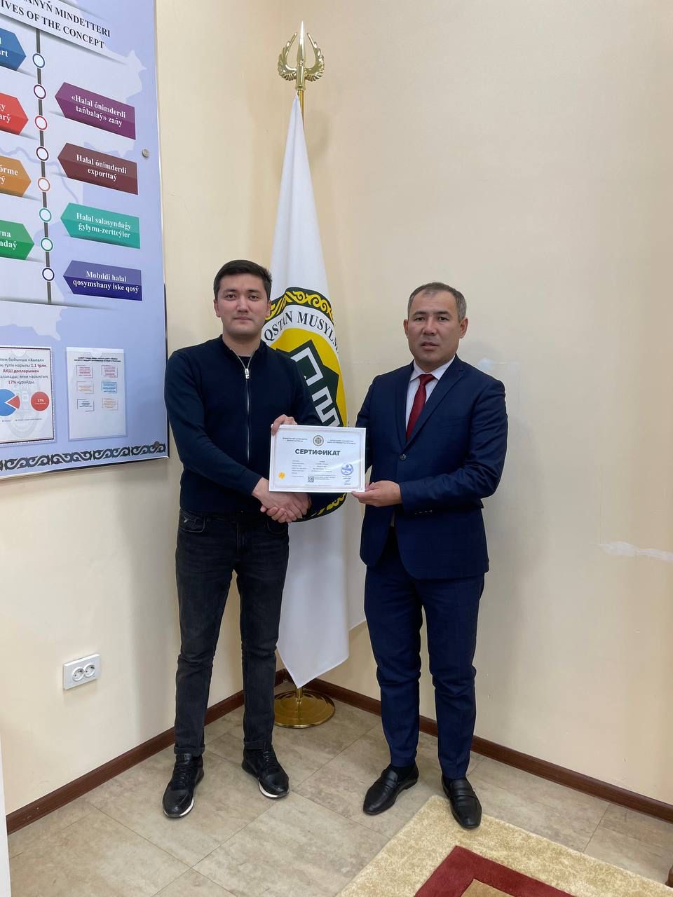 «Халал Даму» директоры Айбек Асқарбекұлы «Burger 87» ЖШС кәсіпорнына «QMDB Halal» сертификатын табыстады.