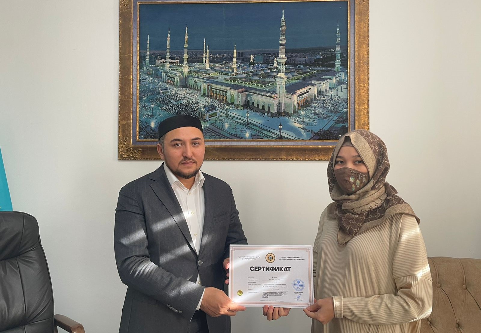 Атырау облысының өкіл имамы Алтынбек Ұтысханұлы «Аминки Витаминки» кондитерлік өнімдерінің Басшысы Жанылсын Болатқызына «ҚМДБ Халал» сертификатын табыстады.