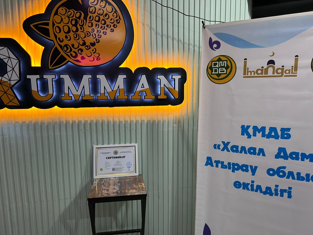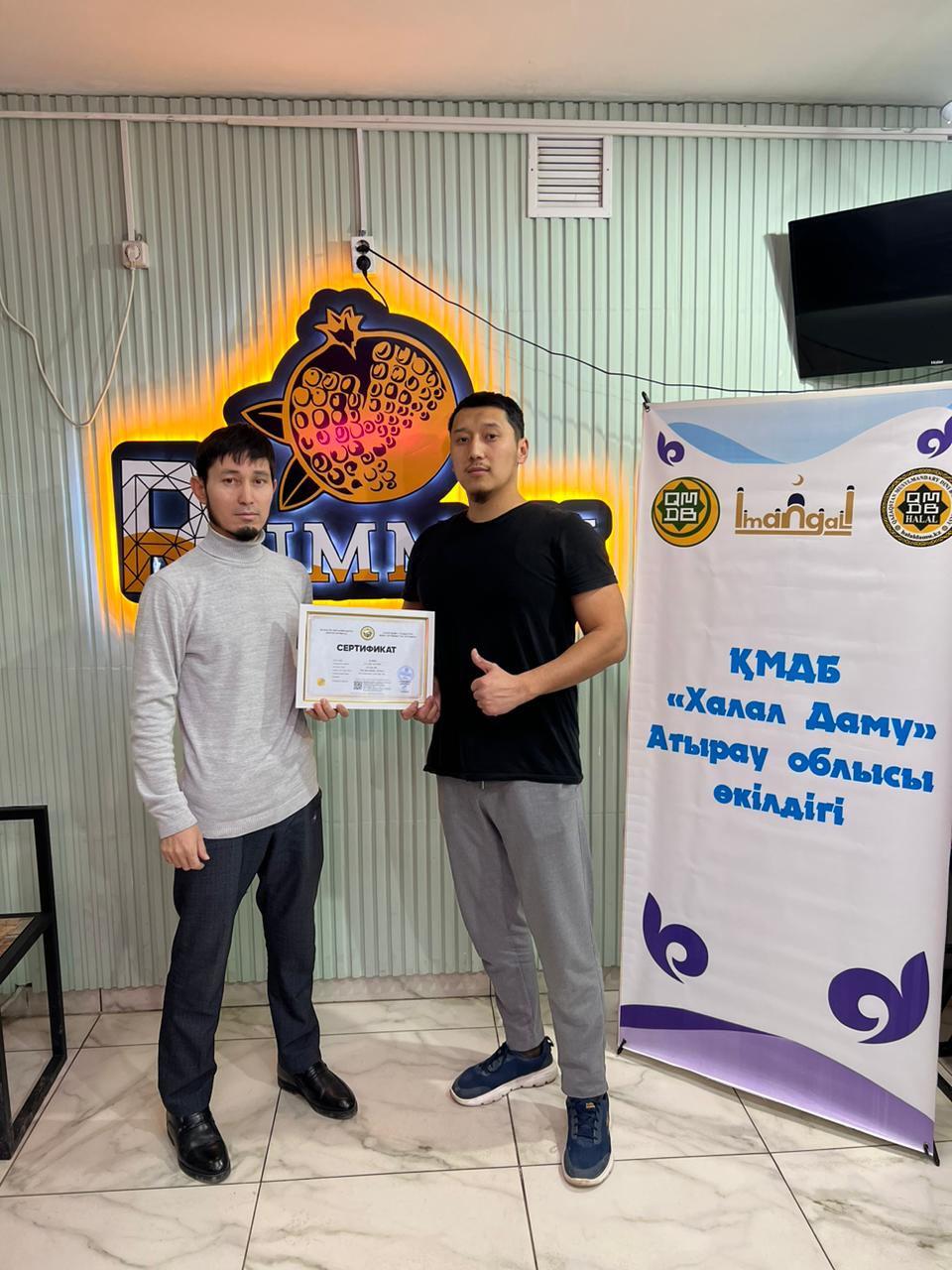 ҚМДБ «Халал Дамудың» Атырау облысы бойынша жауапты өкілі Дәурен Ермаханбетұлы Атырау қаласы, Тұран көшесі 22а-да орналасқан «R-Trans» ЖК, «Rumman» Фаст-фуд өнімдерінің басшысы Қуанышбек Қабдрахманұлына жаңартылған «QMDB Halal» сертификатын табыстады.
