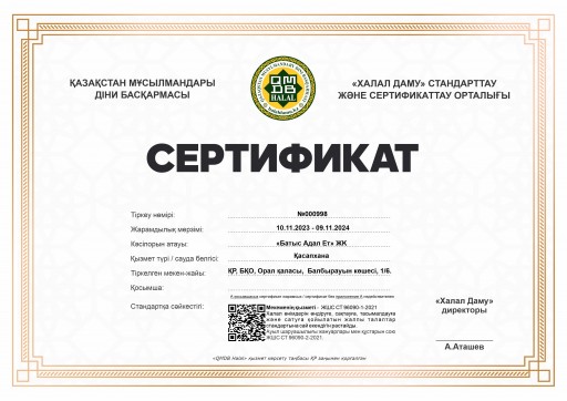 «БАТЫС АДАЛ ЕТ» ҚАСАПХАНАСЫ СЕРТИФИКАТТАЛДЫ