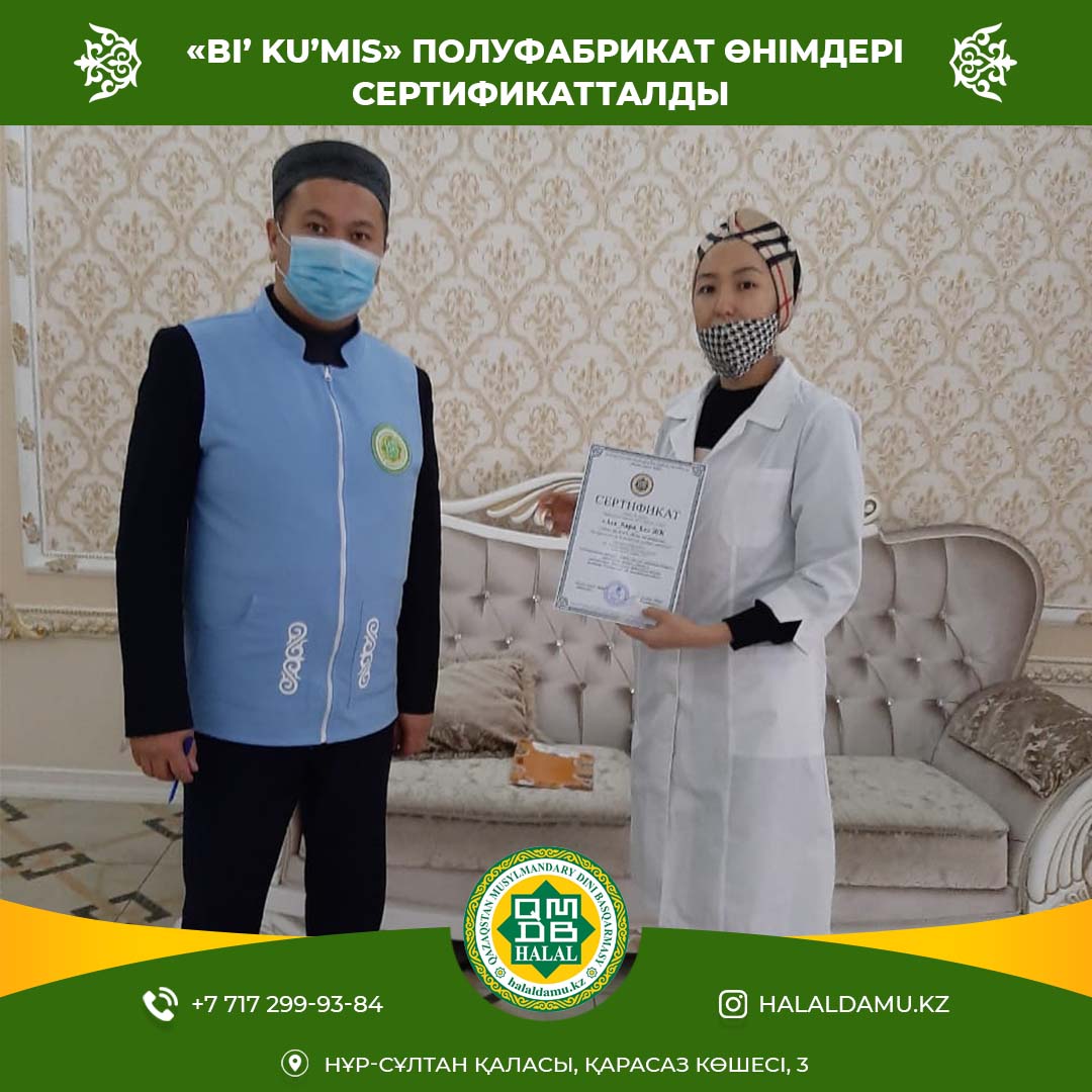 **«Bi’ Ku’mis» restaurant» сауда белгісімен шығарылатын «Asa_Sapa_kz» жеке кәсіпкерлігінің мұздатылған жартылай дайын өнімдері «ҚМДБ халал» стандарты бойынша сертификатталды.** «Халал Дамудың» Алматы қаласы бойынша жауапты өкілі Чадаев Маратхан «Asa_Sapa_kz» кәсіпорны жұмысымен танысып, «ҚМДБ халал» сертификатын табыстады. «Asa_Sapa_kz» кәсіпорнына тиесілі «Bi’ Ku’mis» restaurant» сауда белгісімен шығарылатын мұздатылған жартылай дайын өнімдер «Мал бауыздау және ет өңдеу», «Халал өнімдерді өндіру, өңдеу, дайындау, сақтау, тасымалдау және сатуға қойылатын жалпы стандарт» талаптары бойынша сертификатталды. Жергілікті өкіл Чадаев Маратхан міндетті аудит жұмыстары мен оқу-семинар шараларын жүргізді. «Bi’ Ku’mis» restaurant» өнімдеріне берілген «ҚМДБ халал» сертификаты 29.12.2020-28.12.2021 мерзімі аралығында жарамды. Алматы қаласы, Бостандық ауданы, Арқат шағын ауданы, 55/2 16 мекен-жайынан халал әрі дәмді жартылайфабрикат «Манты от Жанат» өнімдерін таба аласыздар!