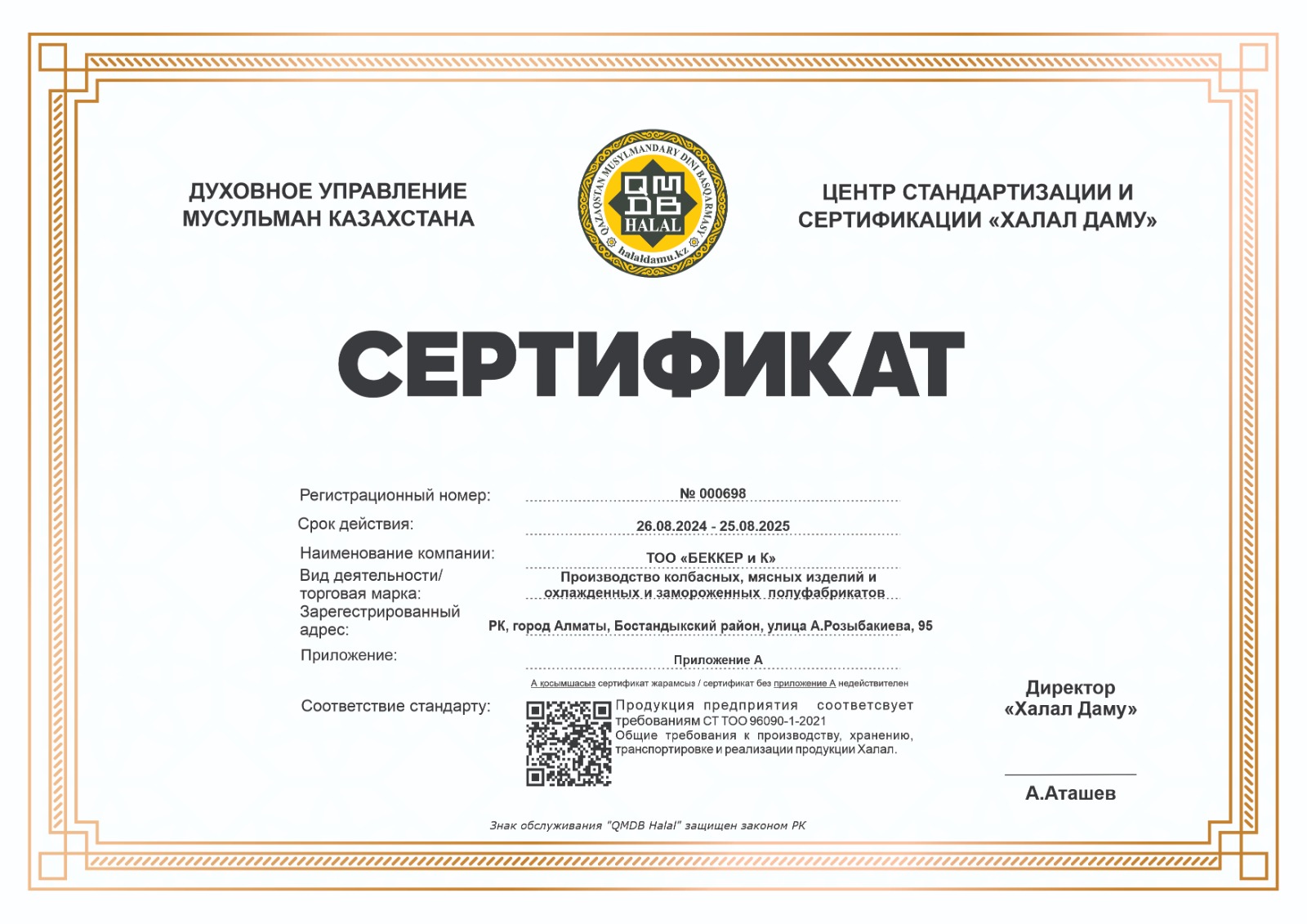 «Беккер и К» кәсіпорнына берілген «QMDB Halal» сертификаты 26.08.2024-25.08.2025 жж мерзімі аралығында жарамды. Мекен-жайы: Алматы қаласы, Бостандық ауданы, А.Розыбакиев көшесі, 95.