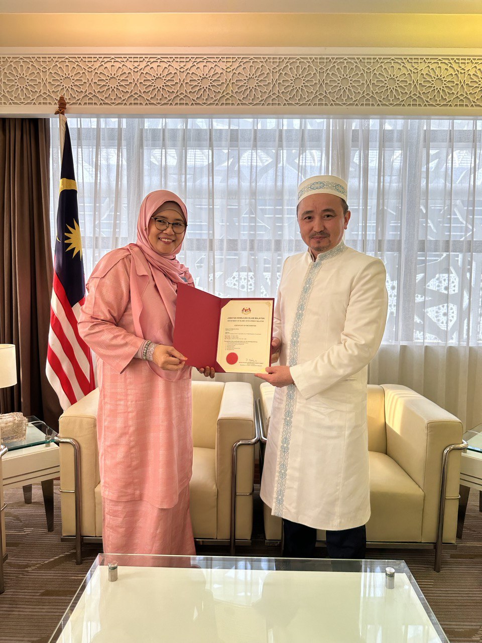 Кездесу барысында Датук Хаджа Хакима Бинти Мохд Юсоф ханым діни басқармаға қарасты Халал Даму стандарттау және сертификаттау орталығын JAKIM тарапынан Қазақстандағы халал сертификаттаушы ұйым ретінде танитындықтарын жеткізіп, растаушы құжат табыстады.