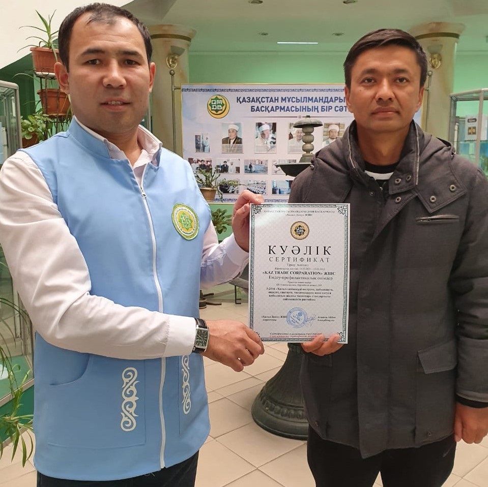 "Kaz Trade Corporation" сауда белгісімен шығарылатын, емдік шөптер негізінде дайындалған профилактикалық өнімдер «ҚМДБ халал» сертификатына ие болды. Жергілікті өкіл Маратхан Чадаев пен технолог мамандардың бірлескен жұмысы нәтижесінен соң «Халал өнімдерді өндіру, өңдеу, дайындау, сақтау, тасымалдау және сатуға қойылатын жалпы талаптар стандарты» бойынша сертификатталып, «ҚМДБ халал» куәлігі табысталды. Пайғамбарымыз Мұхаммедтен (с.ғ.с) жеткен хадистер мен Құран аяттарына сүйене отырып, Ислам медицинасы негізінде жасалған "Kaz Trade Corporation" емдік өнімдері «Халал өнімдерді өндіру, өңдеу, дайындау, сақтау, тасымалдау, және сатуға қойылатын жалпы талаптар стандарты» бойынша сертификатталды. «Kaz Trade Corporation» сауда белгісімен шығарылатын Бальзам өнімдері: «Active life», «Мiracle Spring», «Healthy life», «Premium Complex Алтын», «100 жас», «Ұзақ өмір», «Алмазный», Қара зере майы: «Naqi», «ALTABIEA», «Bio-Zere», «AL-HASANA», «AL-HAYAT», «Flower life», «iSaulyk Black seed», «iSaulyk OMEGA 3,6,9», «iSaulyk GARLIC», «iSaulyk зәйтүн майы», «Naqi OMEGA 3,6,9» Балдырдан жасалған өнімдер: «Ламиналь», «Лактофарэн», «Биолам», «Balalife» берілген сертификаттың жарамдылық мерзімі 16.02.2021-15.02.2022 Қандай да бір ауру-сырқаттан Алла Тағала рұқсат еткен амалдармен оның емін, шипасын іздеу керектігі жайлы ардақты пайғамбарымыздың хадистерінде көптеп айтылады. Абу Саида аль-Худриден келген риуаятта Аллаһ елшісі (с.ғ.с) былай деген: «Аллаһ Тағала бірде-бір ауруды шипасыз бермеген, өлімнен басқасының емін тек зерттеуші біледі, оны надан адам білмейді» (имам Ибн Маджа). Ауруға шипа болатын, халал емдік дәрілеріміз көп болғай!