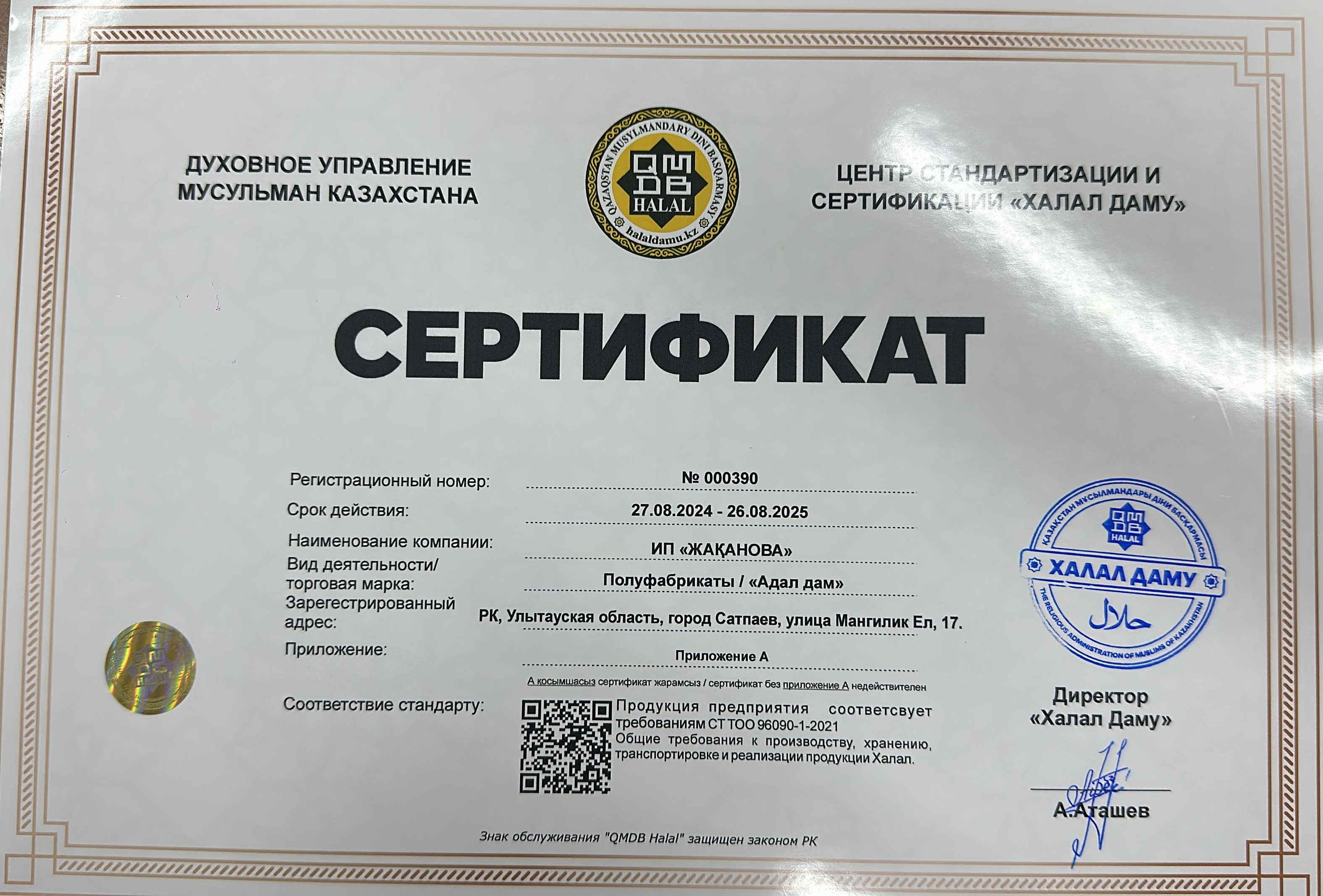 ҰЛЫТАУ ОБЛ.: «АДАЛ ДӘМ» КӘСІПОРНЫ СЕРТИФИКАТТАЛДЫ
