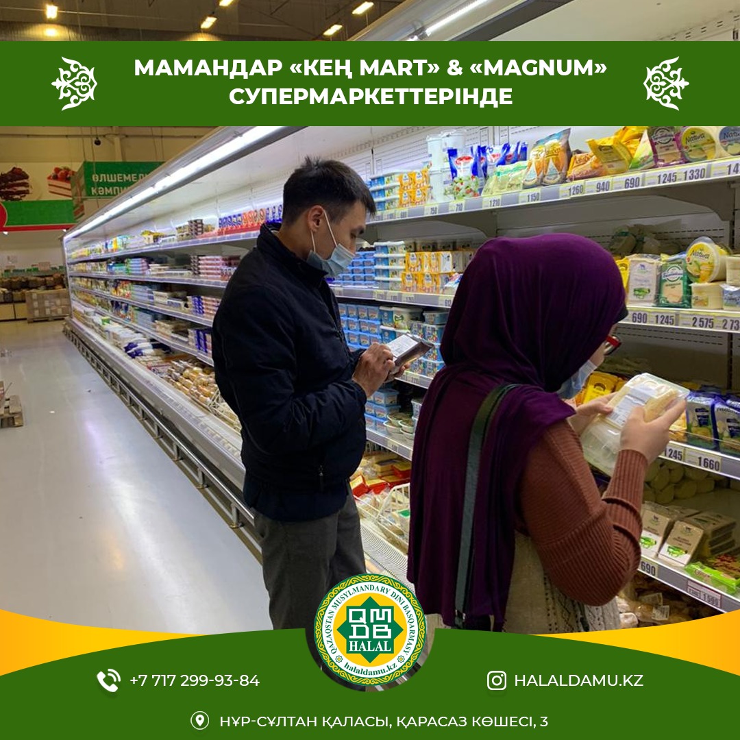 «Халал Даму» мамандары мен Нұр-Сұлтан қаласының жергілікті өкілдері «Kең Mart» & «Magnum» супермаркеттерінде ревизорлық жұмыстар жүргізді. Бақылау-қадағалау шараларының басты мақсаты - сауда орындарында «ҚМДБ халал» өнімдерді сатуға қойылатын стандарт талаптарының сақталуын қадағалау. «ҚМДБ халал» таңбасын заңсыз пайдаланушылардың бар-жоқтығын анықтау. «Magnum» супермаркетінде тұтынушыларға арнайы «ҚМДБ халал» шұжықтар витринасы жасалынып, өнімдер халал стандарт талаптарына сай орналастырылған. Тексеріс кезінде халық жиі тұтынатын «ҚМДБ халал» шұжық, тауық еті, жұмыртқа, ірімшік, сүт, май секілді өнімдердің стандартқа сәйкес орналастырылуы мен сатылуы қадағаланды. "ҚМДБ халал" таңбасын заңсыз пайдаланған кәсіпорын өнімдері анықталмады. «Magnum» & «Кең mart» супермаркеттерінде жүргізілген бақылау-қадағалау жұмыстары тек қана «ҚМДБ халал» сертификатына ие өнімдер мен халал таңбасын заңсыз пайдаланушыларға қатысты орындалғандығын ескертеміз. Аталған сауда орындардағы «ҚМДБ халал» таңбасынан өзге «халал» белгілерімен сатылатын өнімдердің халалдығына жауап бермейтіндігімізді ескертеміз!