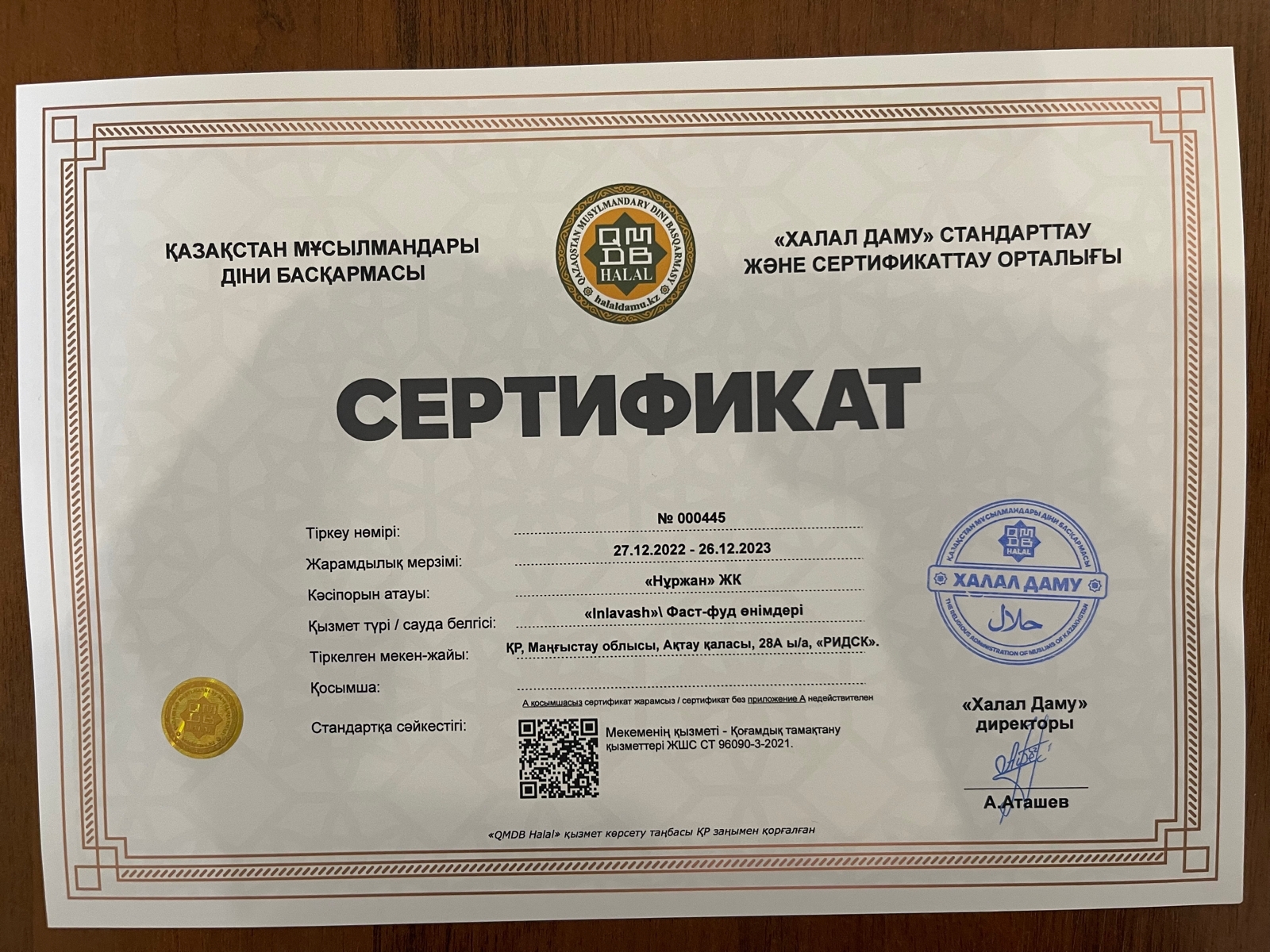 Ақтау қаласы, 28А ы/а-да орналасқан «Нұржан» ЖК «Inlavash» фаст-фуд өнімдеріне ҚМДБ Халал сертификаты табысталды. Сертификаттың мерзімі 26.12.2023 дейін жарамды.