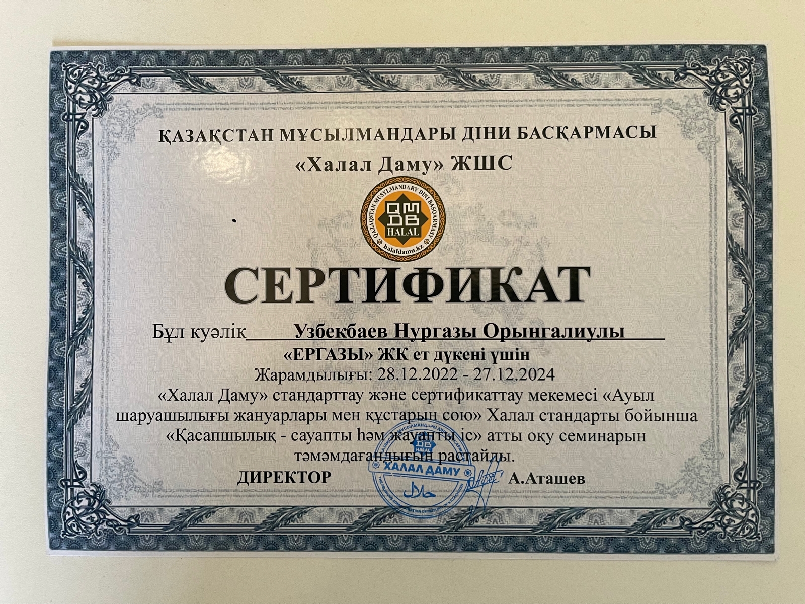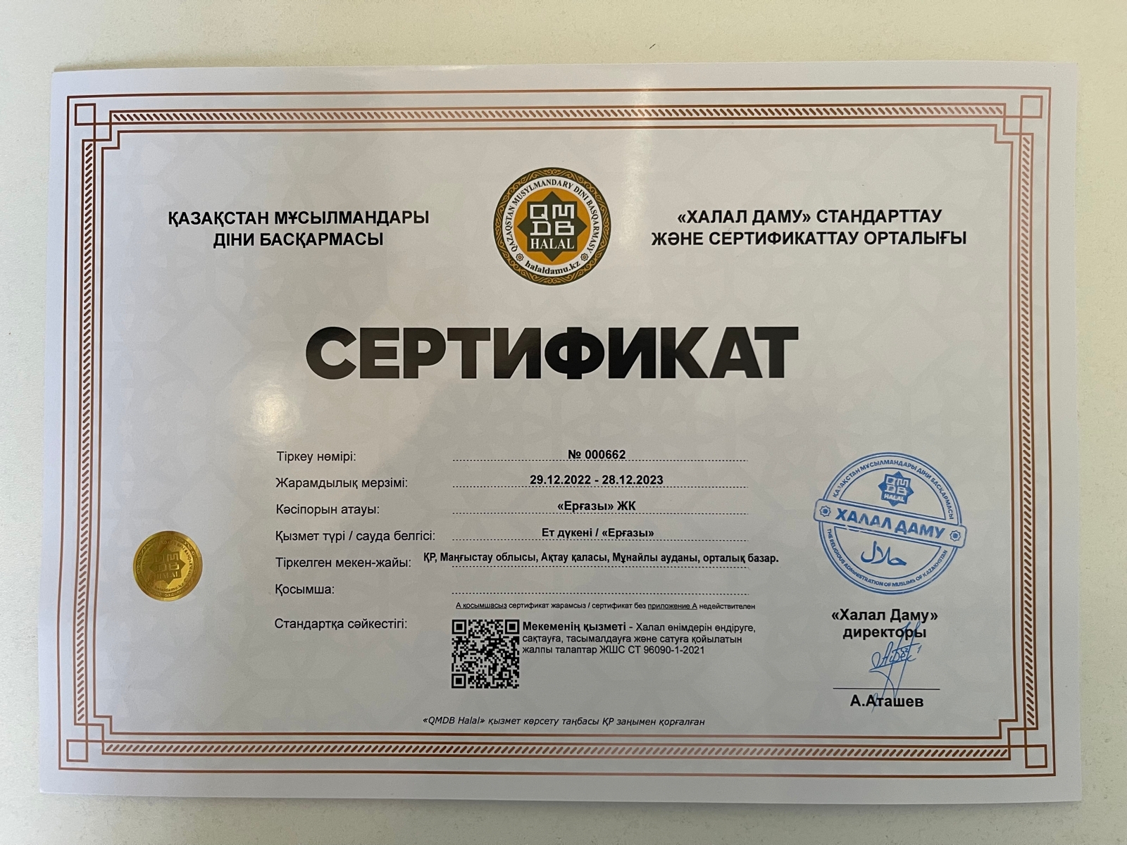 Ақтау қаласы, Мұнайлы ауданы, орталық базарда орналасқан «Ерғазы» ЖК «Ерғазы» ет дүкенінеіне ҚМДБ Халал сертификаты және Нургазы Орынгалиулына қасапшы куәлігі табысталды. Сертификаттың мерзімі 28.12.2023 дейін жарамды.