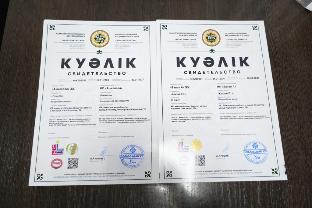 Қасапшы Мәткенов Жомарт Каниевичке «Халал өнімдерді өндіруге, сақтауға, тасымалдауға және сатуға қойылатын жалпы талаптар» халал стандарты бойынша оқу семинарын толық аяқтағанын растайтын сертификат табысталды. Сертификаттау барысында өндіріс үдерісі, шикізаттың құрамы, сақтау және тасымалдау талаптарының сақталуы жан-жақты зерделенді. Нәтижесінде аталған мекемелердің өнімдері халал талаптарына толық сәйкес деп танылды.