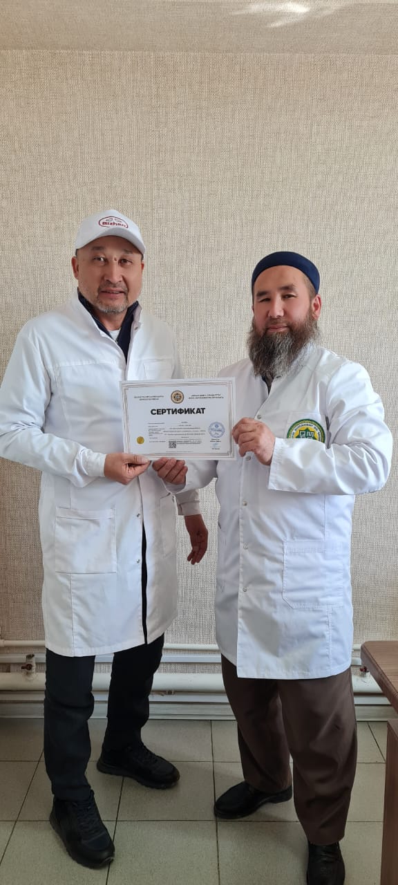 «Халал Даму» өкілі Муталов Науан «МПК БИЖАН» ЖШС кәсіпорнына «QMDB Halal» сертификатын табыстады.