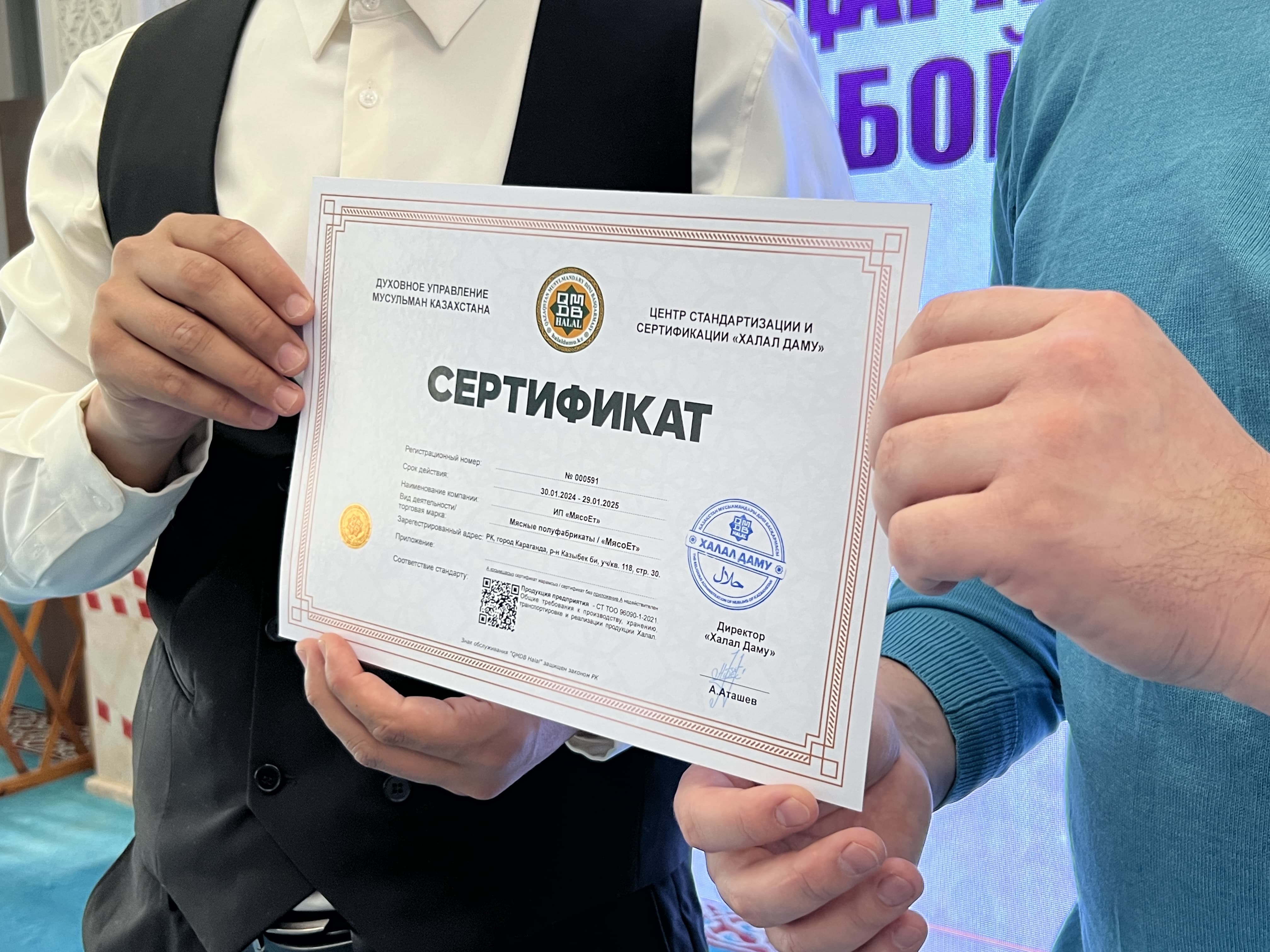 «Мясо-ет» кәсіпорнына берліген халал сертификаты 30.01.2024-29.01.2025 жж аралығында жарамды. Мекен-жайы: Қарағанды қаласы, Қазбек би 118.