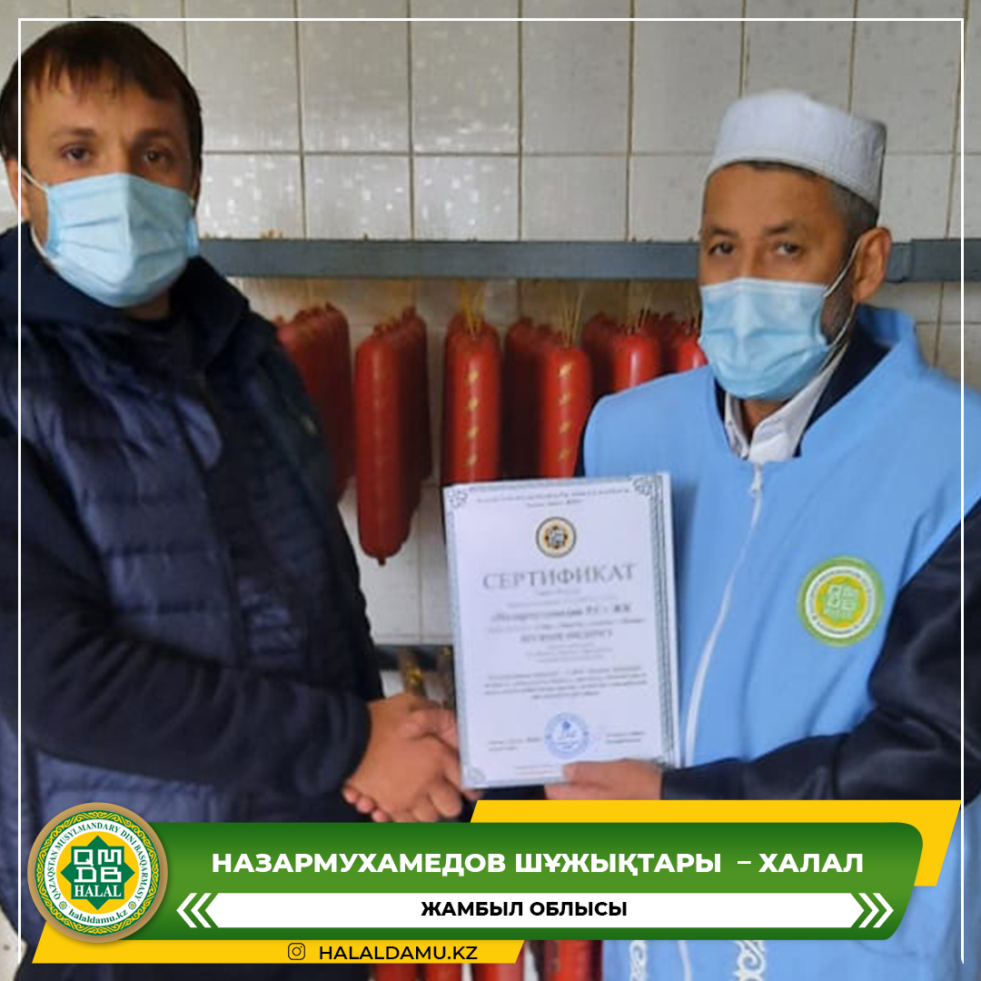 **Жамбыл облысында «Назармухамедов» шұжық цехының - «Сабр», «Мяском», «Адамяс», «Цезарь» сауда белгілерімен шығарылатын шұжықтары «ҚМДБ халал» сертификатына ие болды.** ⠀ «Назармухамедов» шұжық цехы «Мал бауыздау және ет өңдеу», «Халал өнімдерді өндіру, өңдеу, дайындау, сақтау, тасымалдау және сатуға қойылатын жалпы стандарт талаптары» бойынша сертификатталды. ⠀ Технолог мен инспектор-контролер мамандардың тыңғылықты жұмысы және лабораториялық тексеріс қорытындысынан кейін «Халал Дамудың» Жамбыл облысы бойынша жауапты өкілі Миразизов Нурмаджан «Назармухамедов» шұжық цехына «ҚМДБ халал» сертификатын табыстады. ⠀ Жергілікті маманымыз «Назармухамедов» шұжық цехының «Халал Даму» мамандарының бақылауында болатындығын, алдағы уақытта міндетті аудит шаралары орындалатынын ескертіп, отандық халал индустриясын дамытуға қосқан үлесіне алғысын білдірді.