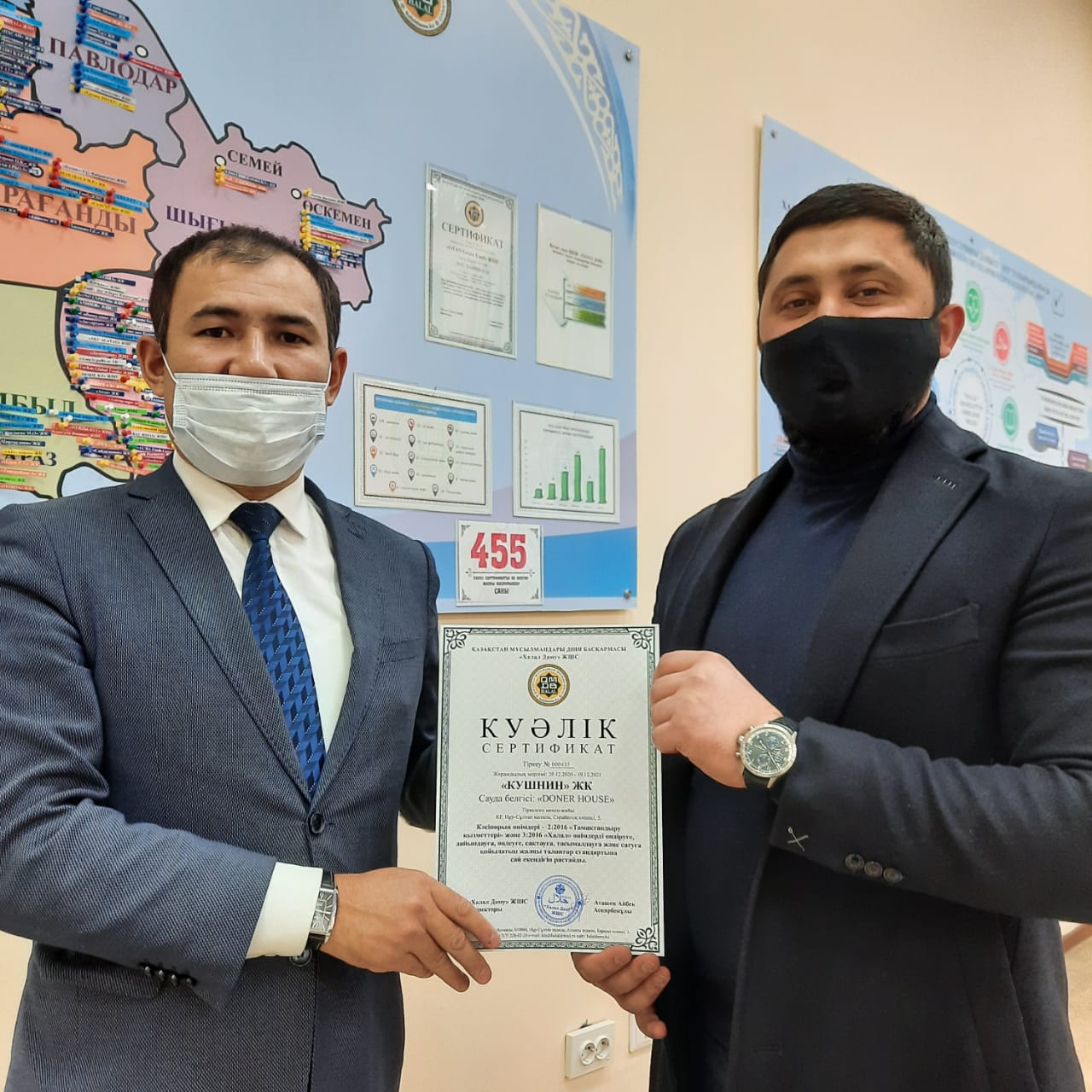 **Елордамыздағы «Doner house» донер дәмханасы «ҚМДБ халал» стандарты бойынша сертификатталды.** Фаст-фуд тағамдарын дайындауда қолданылатын шикізат көздері мен тағамдық қоспалаыр технолог мамандар тарапынан толықтай тексеріліп, қажетті өнімдерге зертханалық сараптама жасалынды. "ҚМДБ халал" стандартына сай келмейтін өнімдер қолданыстан алынды. Кәсіби мамандар жүргізген аудит жұмыстарынан кейін «Кушнин» кәсіпкерлігіне тиесілі «Doner house» дәмханасы «Тамақтану қызметтері», «Халал өнімдерді өндіруге, өңдеуге, дайындауға, сақтауға, тасымалдауға және сатуға қойылатын жалпы стандарт талаптары» бойынша сертификатталып, «Халал Даму» директоры Айбек Асқарбекұлы «ҚМДБ халал» сертификатын табыстады. «Doner house» дәмханасының донер, тауық қанаттары (крылышки), пицца, суши, салат, десерт секілді түрлі өнімдеріне тапсырыс бере аласыздар. Жедел жеткізу қызметі мен мобильді қосымшасы да бар. "Doner house" – отбасылық демалу әрі тынығу дәмханасында балаларға арналған ойын алаңы да қарастырылған. Халал әрі дәмді фаст-фуд өнімдерін ұсынатын "Doner house" дәмханасынан дәм татуды қаласаңыз Нұр-Сұлтан қаласы, Сарайшық көшесі 5, ВП-14 мекен-жайына шақырамыз!
