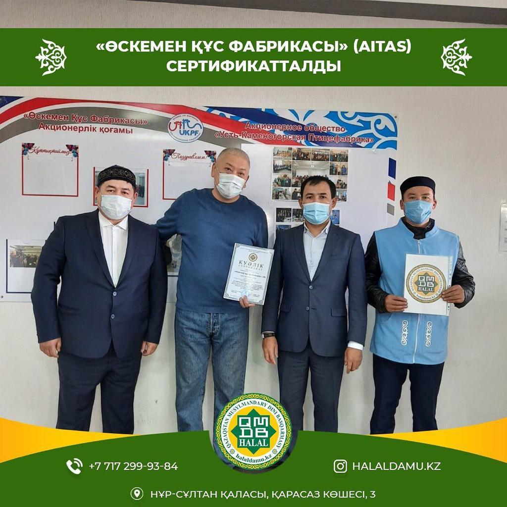 ***Отандық нарықтағы құс өнімдерінің 24 % құрайтын Өскемен құс фабрикасы(AITAS) «ҚМДБ халал» стандарты бойынша сертификатталды.** Сертификат табыстауға «Халал Даму» директоры Айбек Асқарбекұлы, Өскемен аймағының бас имамы Ермек Мұқатай, жергілікті инспектор-контролер Үмбет Досжан және Өскемен құс фабрикасының бас директоры Ришат Мырзағазыұлы қатысты. «Кус-Вкус» және «UKPF» сауда белгілерімен шығарылатын «Өскемен құс фабрикасының» 85 түрлі өнімі «Мал бауыздау және ет өңдеу», «Халал өнімдерді өндіру, өңдеу, дайындау, сақтау, тасымалдау және сатуға қойылатын жалпы стандарт» талаптары бойынша сертификатталды. ️Құс фабрикасында «Халал Даму» мамандары тарапынан оқытылған, мұсылман қасапшылар жұмыс жасайды. Барлық құс тек қолмен бауыздалады. «AITAS» құс фабрикасына берілген сертификаттың жарамдылық мерзімі: 1.10.2020-30.09.2021ж*