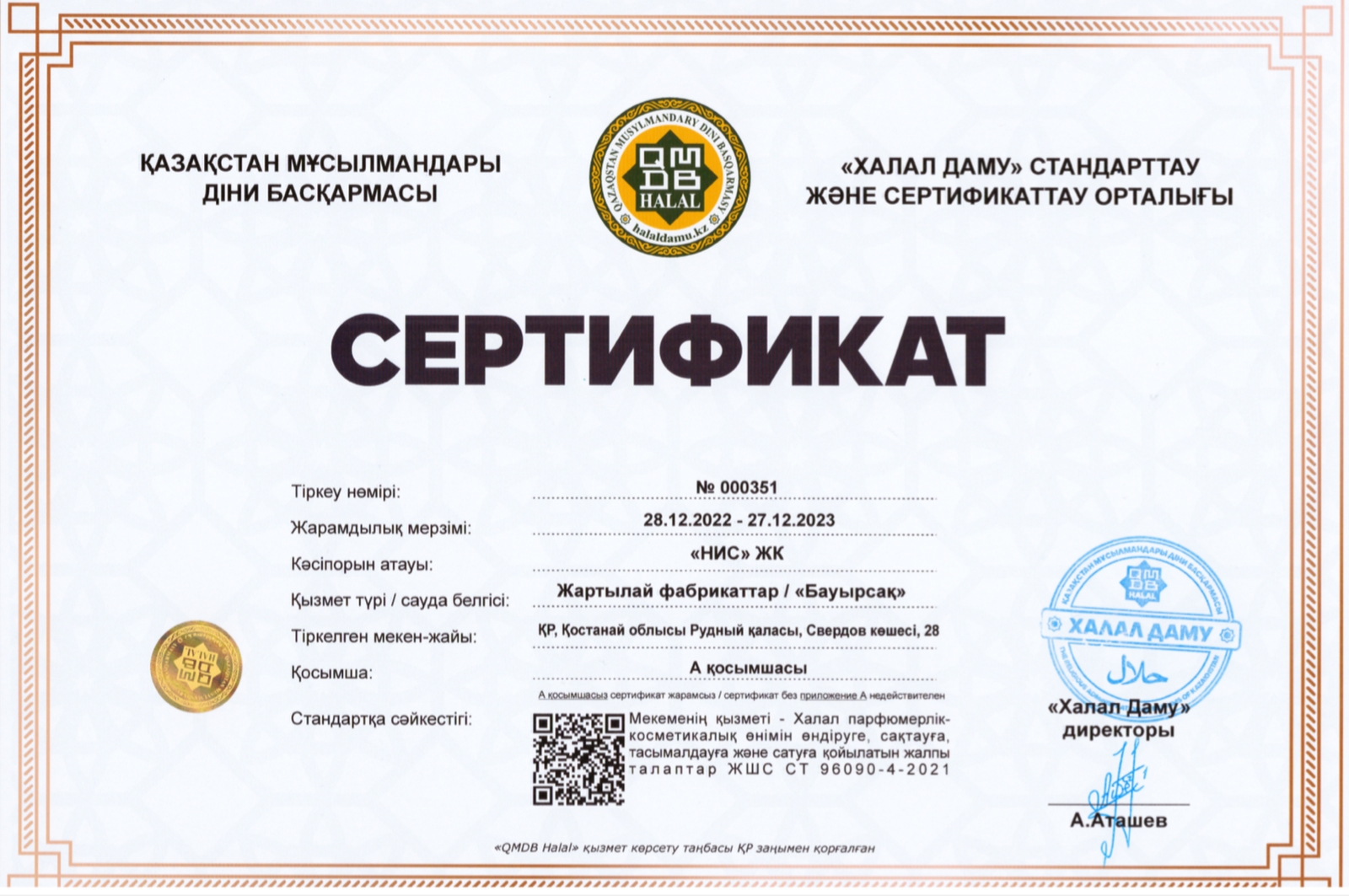 Сертификаттың жарамдылық мерзімі 27.12.2023 жылға дейін.