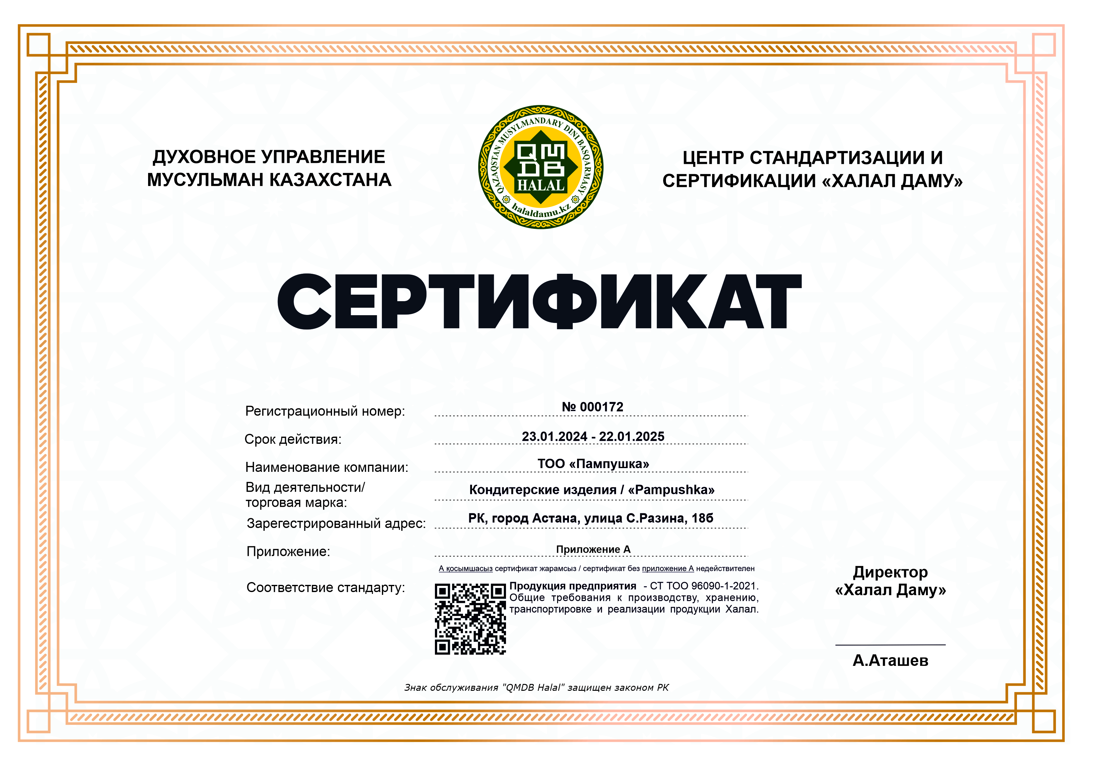 «Pampushka» кондитерлік өнімдеріне берілген «QMDB Halal» сертификаты 23.01.2024-22.01.2025 жж мерзімі аралығында жарамды. Мекен-жайы: Астана қаласы, С.Разина көшесі, 18Б.