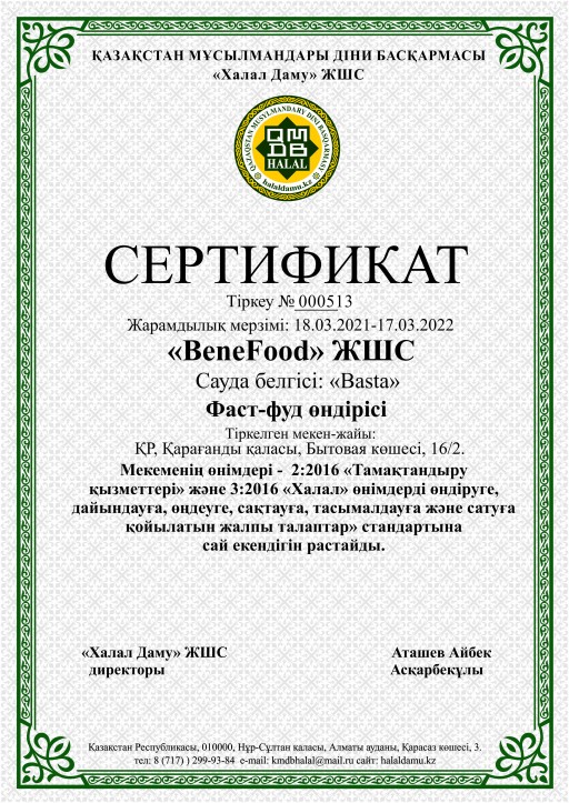 "Basta" фаст-фуд өнімдері Қарағанды қаласы, Бытовая көшесі, 16/2 мекен-жайында өндіріледі. Кәсіпорынға берілген сертификат 18.03.2021- 17.03.2022 мерзімі аралығында жарамды екендігін хабарлаймыз.