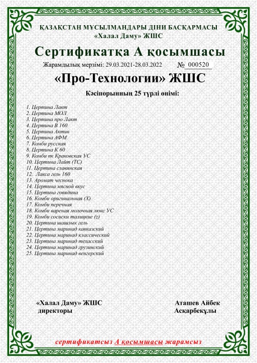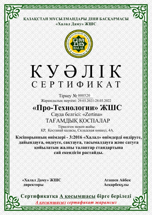 Қарағанды облысында тағамдық қоспа әзірлейтін алғашқы кәсіпорын "QMDB halal" сертификатын иемденді. "Про технологии" кәсіпорнының "Zertina" сауда белгісімен шығарылатын 25 түрлі тағамдық қоспалары 3:2016 «Халал өнімдерді өндіруге, дайындауға, өңдеуге, сақтауға, тасымалдауға және сатуға қойылатын жалпы талаптар» стандарты бойынша сертификатталды.