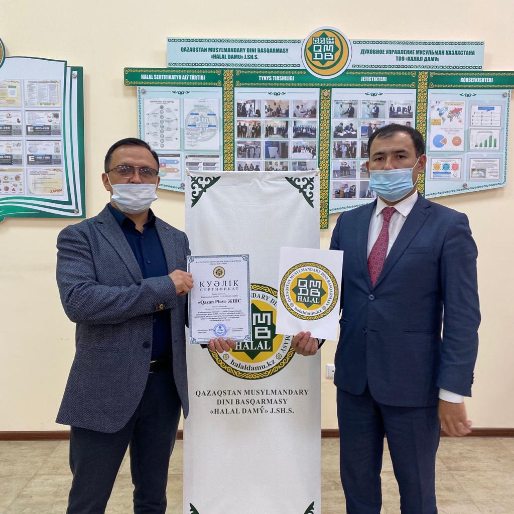 *Cертификатты «Халал Даму» директоры Айбек Асқарбекұлы табыстады. «Qazan plov»ЖШС өнімдері «Тамақтандыру қызметтері» және «Халал өнімдерді өндіру, өңдеу, дайындау, сақтау, тасымалдау және сатуға қойылатын жалпы стандарт» талаптары бойынша сертификатталды. Cертификаттың жарамдылық мерзімі: 21.10.2020-20.10.2021ж*
