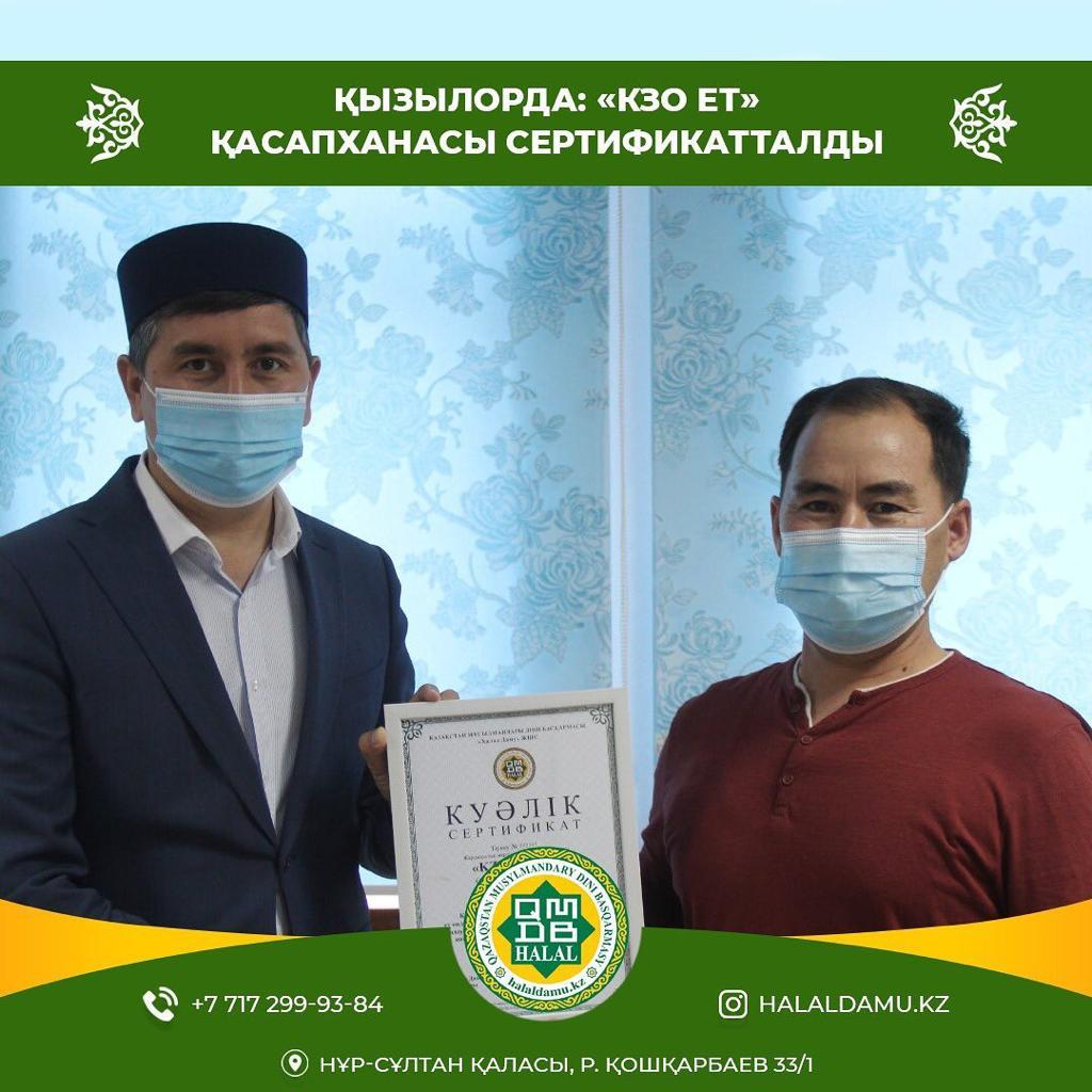 ***Қызылорда қаласында «KZO ЕТ» қасапханасы «ҚМДБ халал» сертификатына ие болды.** Қасапхананың басты ерекшелігі - мал сою процессін онлайн режимде, видеобақылау арқылы қадағалауды жүзеге асыруында.Бейнебақылау - мал бауыздау және ет өңдеуге қойылатын шариғат және стандарт талаптарының орындалуын 24 сағат бойы кез-келген жерден бақылауға, таспаны қайталап көруге мүмкіндік береді. «ҚМДБ халал» сертификатын Қызылорда облысының бас имамы Болатбек Ұласқанұлы табыстады. «Халал Дамудың» жергілікті өкілі Перизат Шарапатова қасапхана аймағында аудит жұмыстарын жүргізіп, қасапшылардың стандарт талабына сай жұмыс жасауын қадағалады. Қасапшыларға шариғат және халал стандарт талабы бойынша мал сойып, ет өңдеудің ерекшеліктері мен маңыздылығы жөнінде оқу-семинар өткізілді. «KZO ет» қасапханасы «Мал бауыздау және ет өңдеу стандарт» талаптары бойынша сертификатталды. «КZO ет» өнімдеріне берілген «ҚМДБ халал» сертификатының жарамдылық мерзімі: 21.06.2020-22.06.2021*