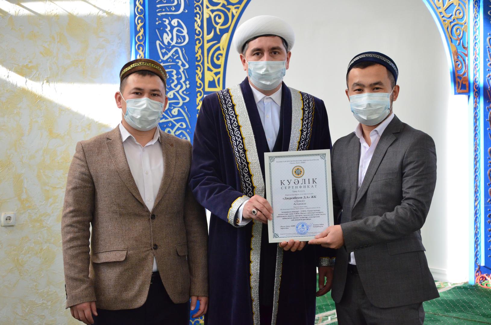 **ҚМДБ-ның Қызылорда облысы бойынша бас имамы Болатбек Ұласқанұлы Шиелі ауданына жасаған жұмыс сапарында «Дәмді» асханасына «ҚМДБ халал» сертификатын табыстады.** «Дауренбеков Д.А» ЖК «Дәмді» асханасының өнімдері ҚМДБ-ға қарасты «Халал Даму» ЖШС-нің тексеруінен өту барысында 2:2016 «Тамақтандыру қызметтері» және 3:2016 «Халал» өнімдерді өндіруге, дайындауға, өңдеуге, сақтауға, тасымалдауға және сатуға қойылатын жалпы талаптар» стандарттарының талаптарына сай екендігі расталды.