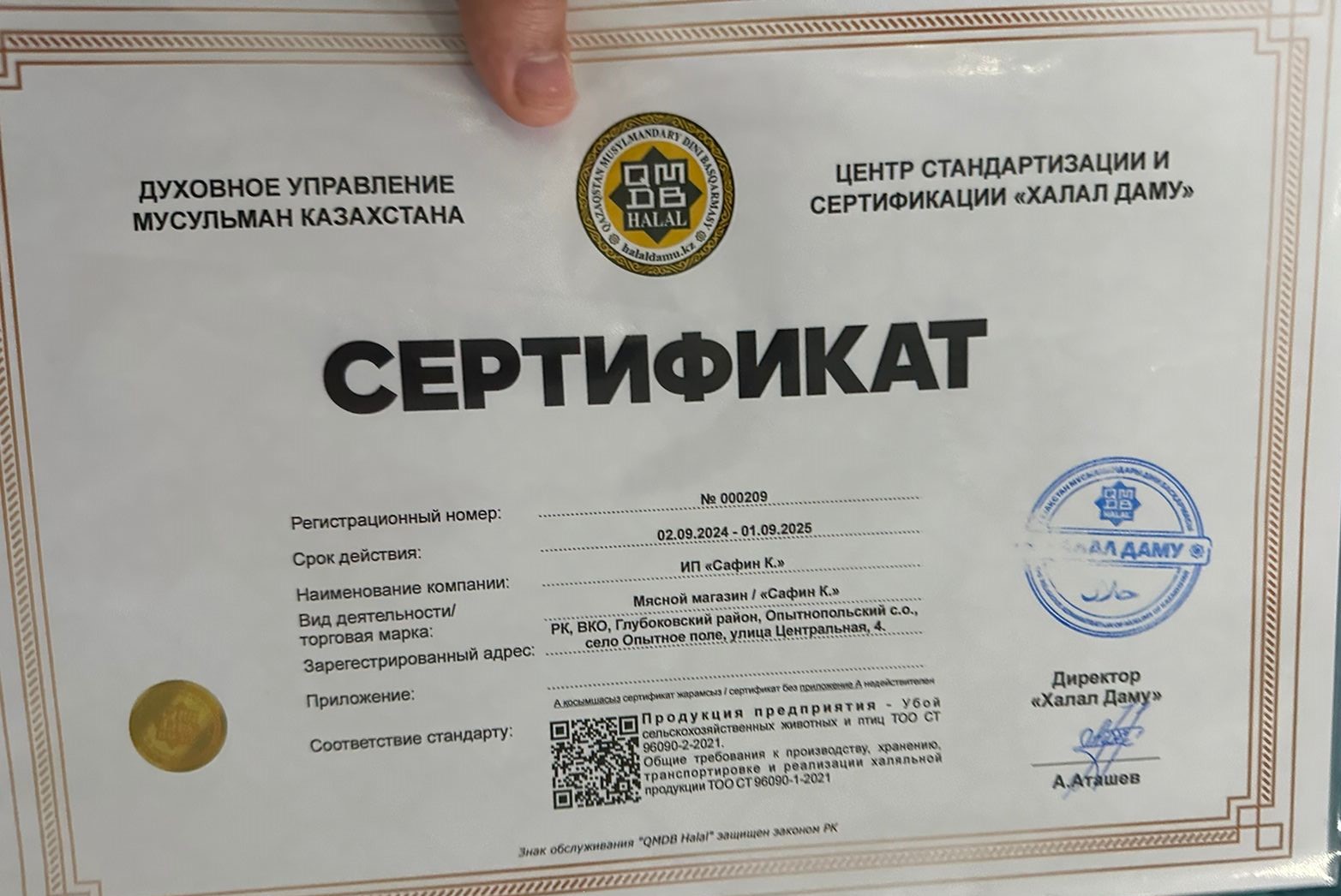Шығыс Қазақстан облысындағы «Сафин К» ет дүкені «QMDB Halal» стандарты талаптарына сай сертификатталды. «Халал Даму» технологы Мейіржан Бауыржанұлы мен Қуаныш Қасымханұлы ет дүкені өкіліне «QMDB Halal» сертификатын табыстады.