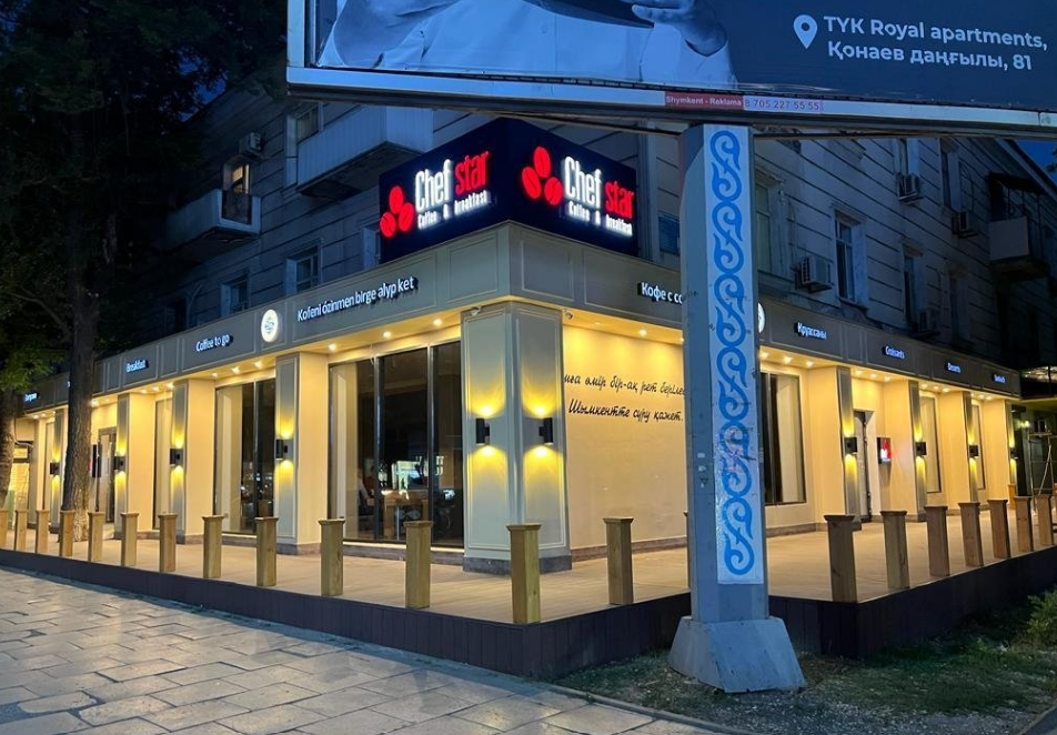 «Chef Star» кофеханасының мекен-жайы: Шымкент қаласы, Тәуке хан даңғылы, 64.