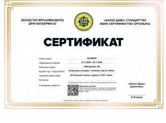 «Erekshe cake & coffee» дәмханасына берілген халал сертификаты 21.11.2024-20.11.2025 жж аралығында 1 жылға жарамды. Мекен-жайы: Шымкент қаласы, Нұрсат-2, 29/4, 3 блок.