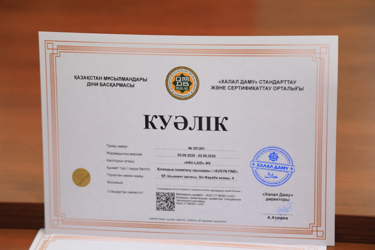«Susyn fine» кәсіпорнына берілген халал сертификаты 03.09.2025-02.09.2026 жж мерзімі аралығында жарамды. Мекен-жайы: Шымкент қаласы, Әл-Фараби алаңы, 4.