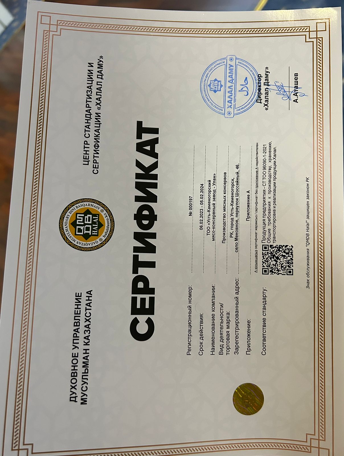 «Халал Дамудың» Өскемен қаласы бойынша өкілі Үмбет Досжан «Усть-Каменогорский мясо-консервный завод - Улан» ЖШС кәсіпорнына жаңартылған «QMDB Halal» сертификатын табыстады.