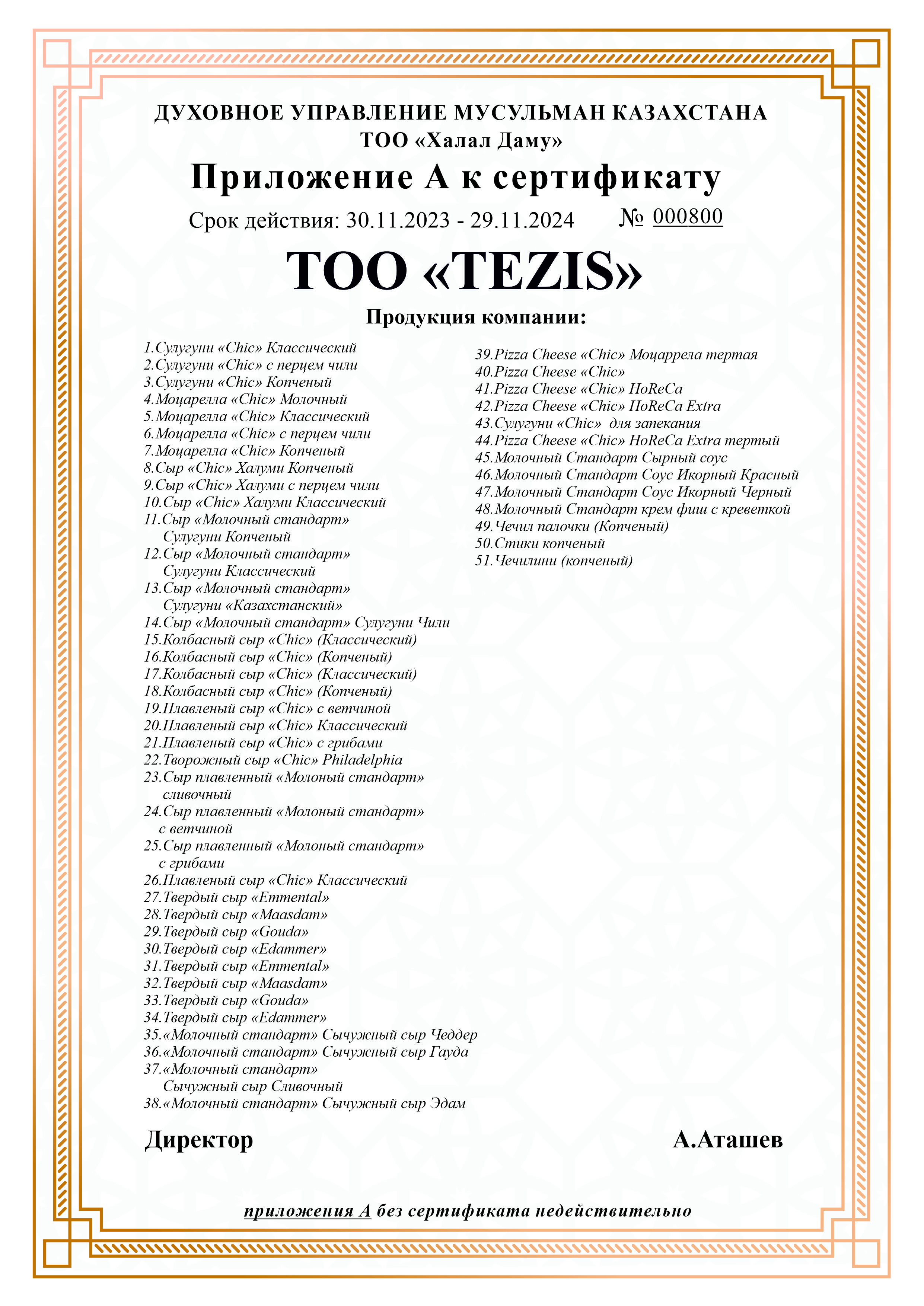 «Tezis» кәсіпорнының «Chic» сауда белгісімен шығарылатын сүт өнімдеріне берілген «QMDB Halal» сертификаты 30.11.2023-29.11.2024 мерзімі аралығында бір жылға жарамды. Мекен-жайы: СҚО, Айыртау ауданы, Саумалкөл ауылы, МКР көшесі, 22а.