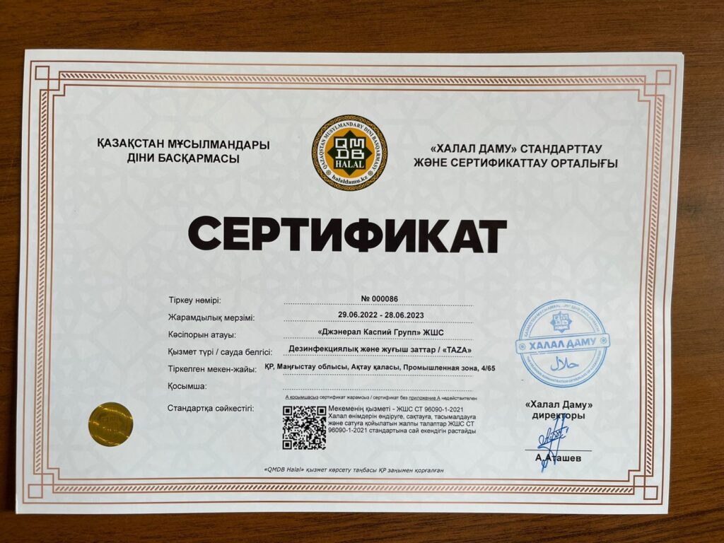 «Джэнерал Каспий Групп» ЖШС-не тиелесіне «Таза» сауда белгісімен шығарылатын дезинфекциялық өнімдер «QMDB Halal» сертификатына ие болды.