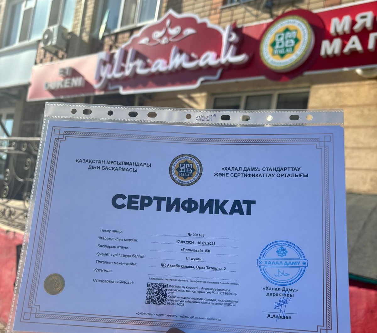 «Гюльчатай» ет дүкеніне берілген «QMDB Halal» сертификаты 17.09.2024-16.09.2025 жж мерзімі аралығында жарамды. Мекен-жайы: Ақтөбе қаласы, Ораз Тәтеұлы, 2.