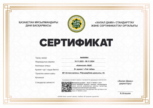 «Toi Tabaq» ет дүкеніне берілген сертификат 10.11.2023-09.11.2024 мерзімі аралығында жарамды. Мекен-жайы: Астана қаласы, Р.Қошқарбаев көшесі, 34