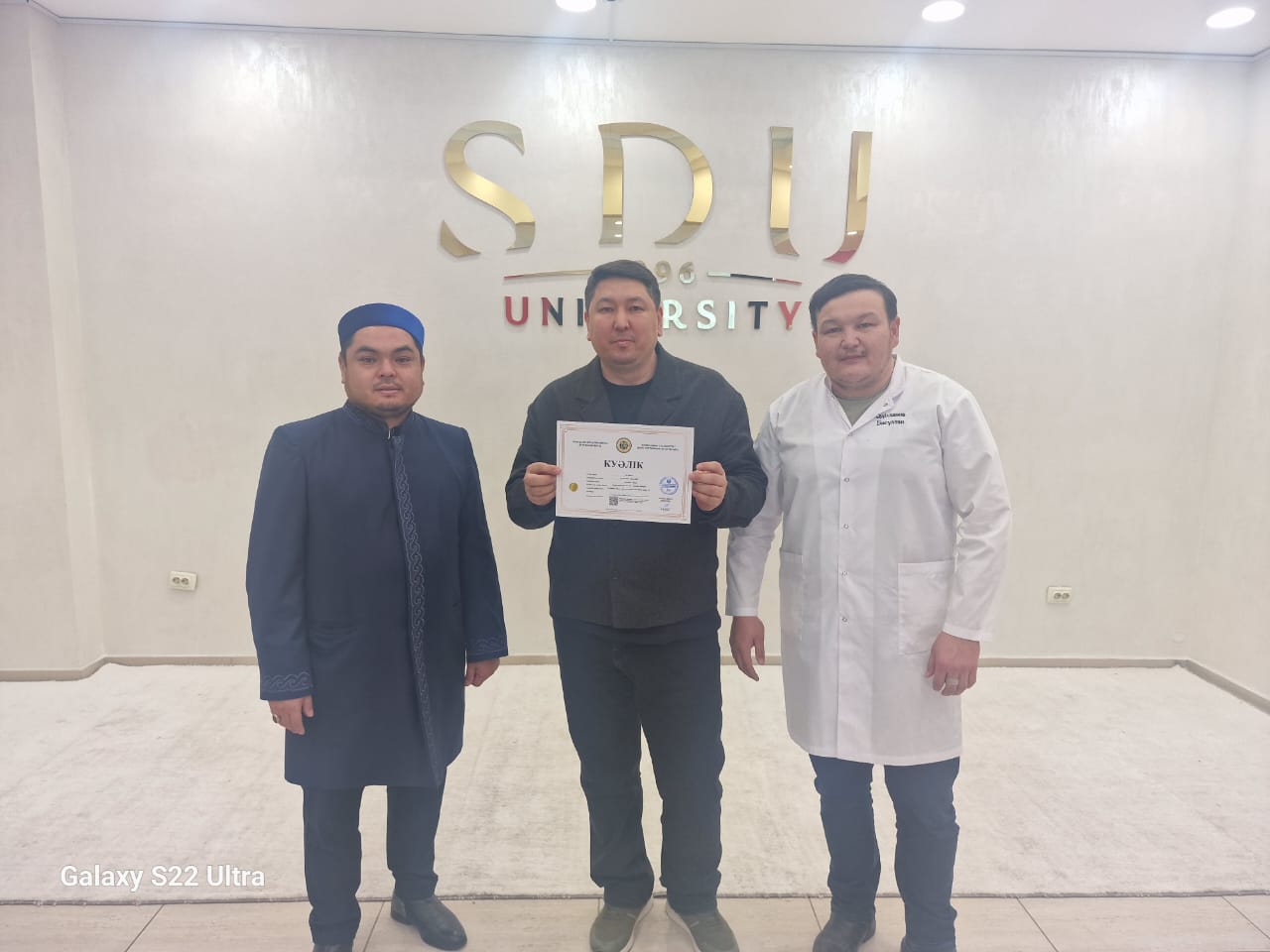 Алматыдағы «SDU University»-ң «Naubay bakery» асханасы «QMDB Halal» стандарты талаптарына сай сертификатталды. Аталған асхана «Халал өнімдерін өндіруге, сақтауға, тасымалдауға және сатуға қойылатын жалпы талаптар ЖШС СТ 96090-1-2021» стандартына сәйкес деп танылды. Сертификатты Қарасай ауданының бас имамы Дәуренбек Жандосұлы табыстады.
