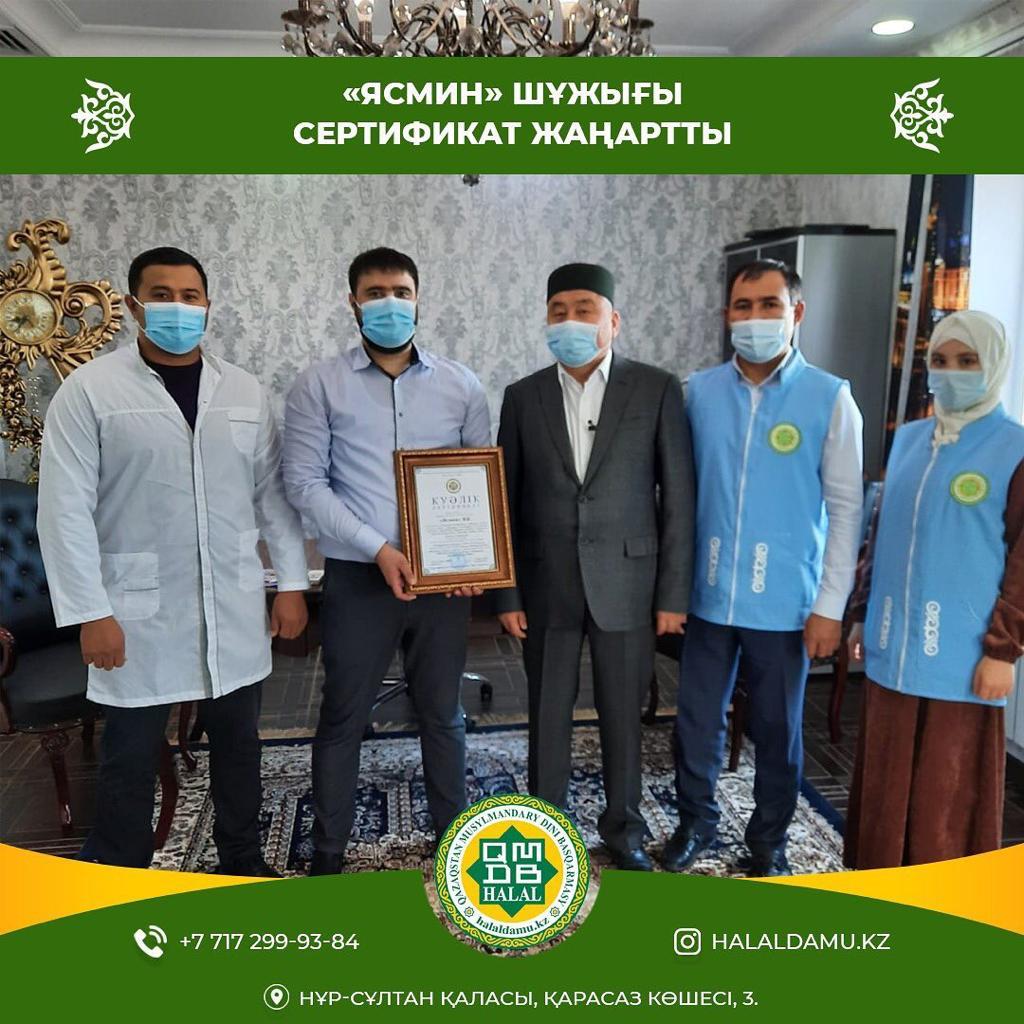 ***Нұр-Сұлтан қаласында орналасқан ірі шұжық цехтардың бірі - «Ясмин» кәсіпорны «ҚМДБ халал» сертификатын жаңартты.** Бас мүфтидің кеңесшісі Мекежанов Балтабай Уәжитұлы «Ясмин» кәсіпорнына «Халал өнімдерді өндіру, өңдеу, дайындау, сақтау, тасымалдау және сатуға қойылатын жалпы стандарт» талаптары бойынша «ҚМДБ халал» сертификатын табыстады. ️Елорда тұрғындарына «Мяском», «Столичные деликатесы», «Алсем», «Баракат» т.б сауда белгілермен танылған «Ясмин» шұжық цехын бақылау-қадағалау шараларын «Халал Даму» директоры Айбек Асқарбекұлы, технологтар Еркетаң Айдынқызы мен Арайгүл Бақытқызы орындады. Сертификат жаңарту барысында «Ясминнің» дайын шұжық өнімдері мен тағамдық қоспалары тағы да кезекті лабораториялық тексерістен өткізілді. Зертхана нәтижесі - оң.*