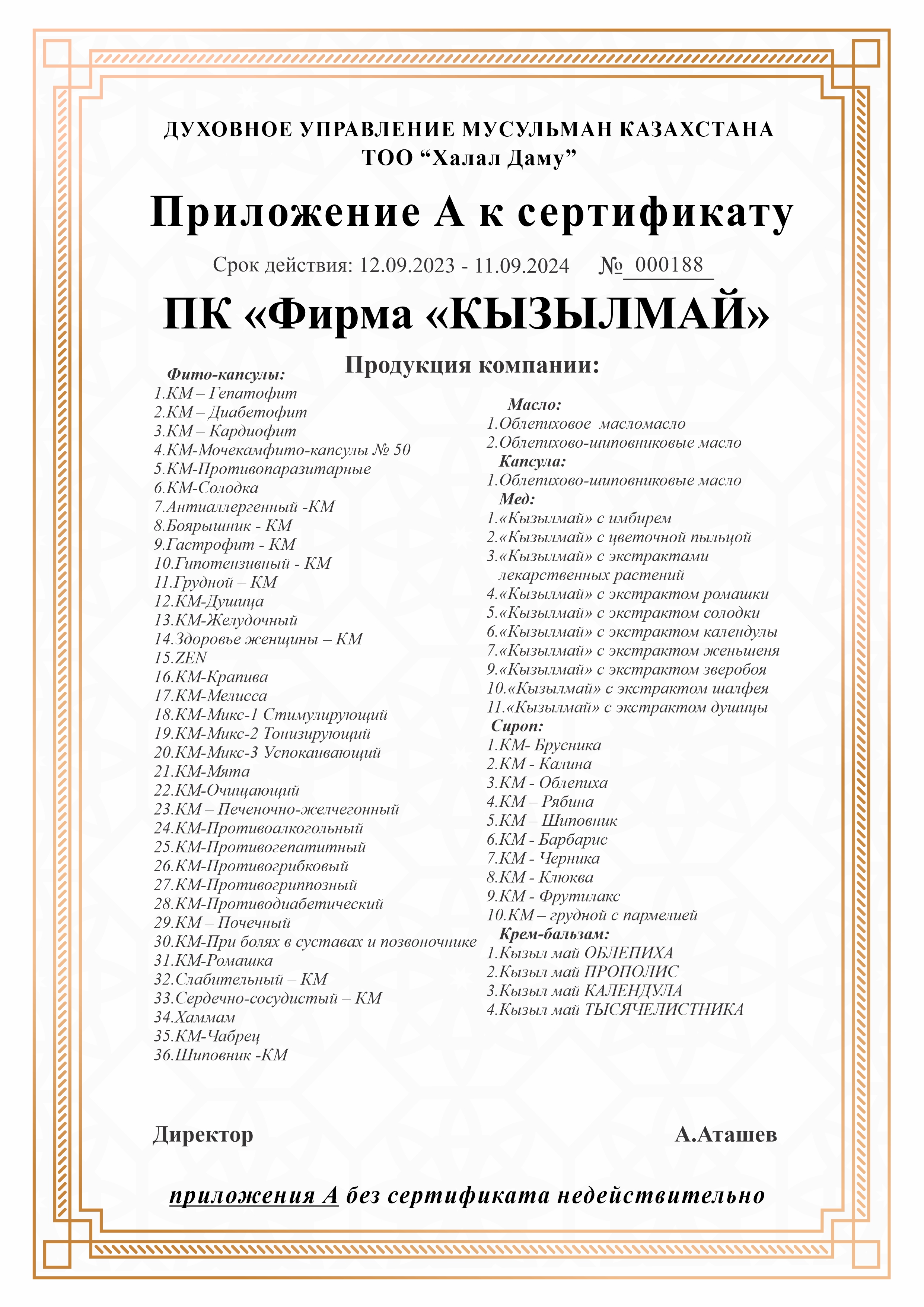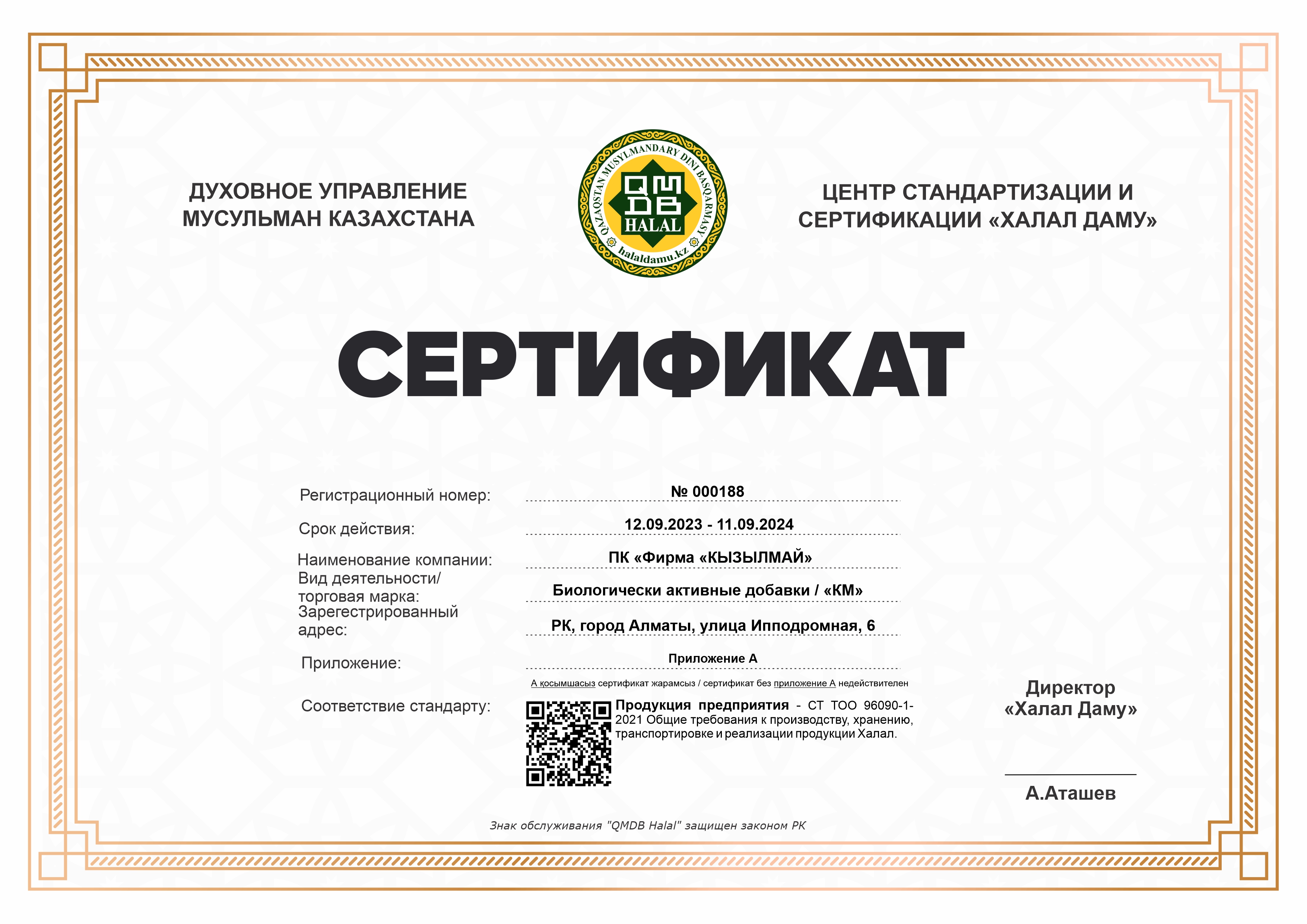 «Қызыл май» өніміне берілген халал сертификаты 12.09.2023-11.09.2024 мерзімі аралығында бір жылға жарамды. Кәсіпорын мекен-жайы: Алматы қаласы, Ипподромная көшесі, 6.